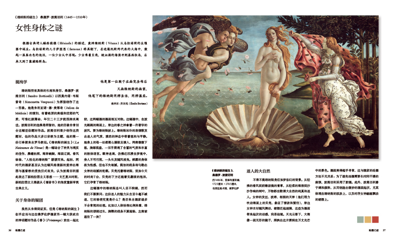 维纳斯没有具体的长相和身形,桑德罗﹒波提切利(Sandro Botticelli)以西莫内塔·韦斯普奇(Simonetta Vespucci)为原型创作了这一形象。她是朱利亚诺·德·美第奇(Julien de Médicis)的情妇,有着绝顶的美貌和忧郁的气质,可惜红颜薄命,年仅二十三岁就因肺炎离世。波提切利的选择是明智的,她的形象非常切合这幅世俗题材作品。波提切利很少创作这类题材,他的作品大多以宗教为主题,他的第一份订单便来自罗马教廷。《维纳斯的诞生》(La Naissance de Vénus)是一幅结合了神灵与现实的佳作,晨曦初照,海岸蜿蜒,海面辽阔,春风徐徐,“人性化的维纳斯 ”缓缓而来。起初,同时代的画家甚至认为这幅风格清新的爱神出海图与基督教的受洗仪式有关,认为波提切利借此表达了新柏拉图主义思想—文艺复兴时期,新柏拉图主义提倡从《福音书》的角度重新审视古典主义。
