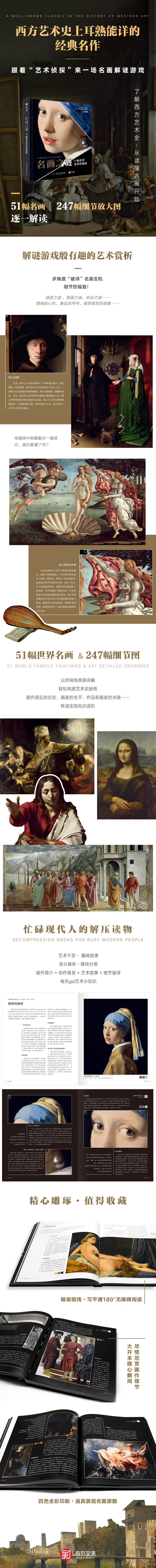 本书共收录51幅世界名画,不仅详细阐释作品和画家之间的关联、作品中不为人知的细节,还按时间线的顺序排列,从故事中为你构建艺术史的脉络。从历史中解读图像,同时也能从图像中解读出特定时代的思想结构,因为图像也是历史留存的证据。一件伟大的艺术作品,可以为观赏者打开一扇窗,提供一个看世界的全新角度,就让我们做一回“艺术侦探”,一起解密画中的故事。