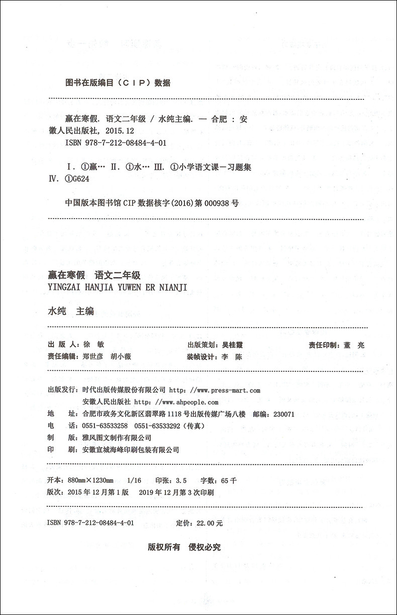 2020新版上海小学寒假作业 语文 2年级/二年级 赢在寒假 小学生寒假作业本练习册 基础巩固拓展提升新课预习 安徽人民出版社