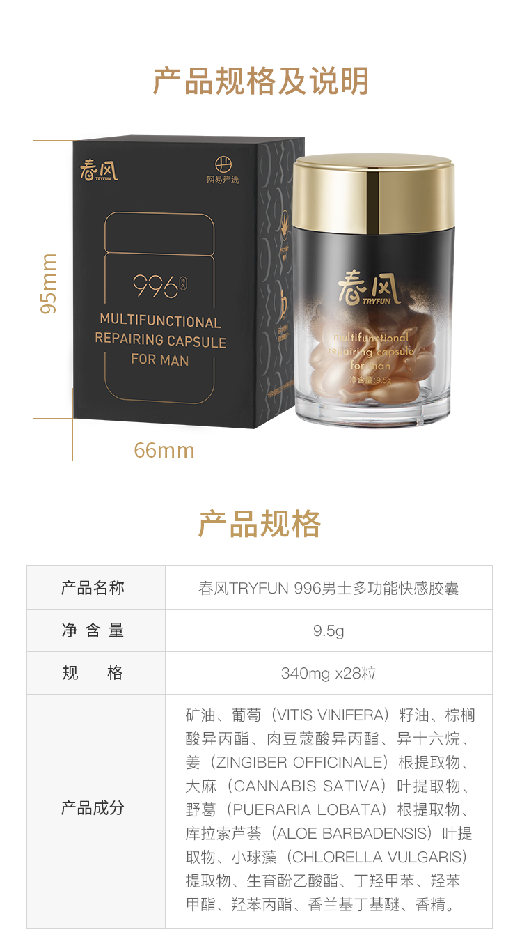 【经典爆款】网易春风TryFun996男士多功能快感胶囊 黄金养护私处 增加活力夫妻房事成人情趣用品 便携型28粒