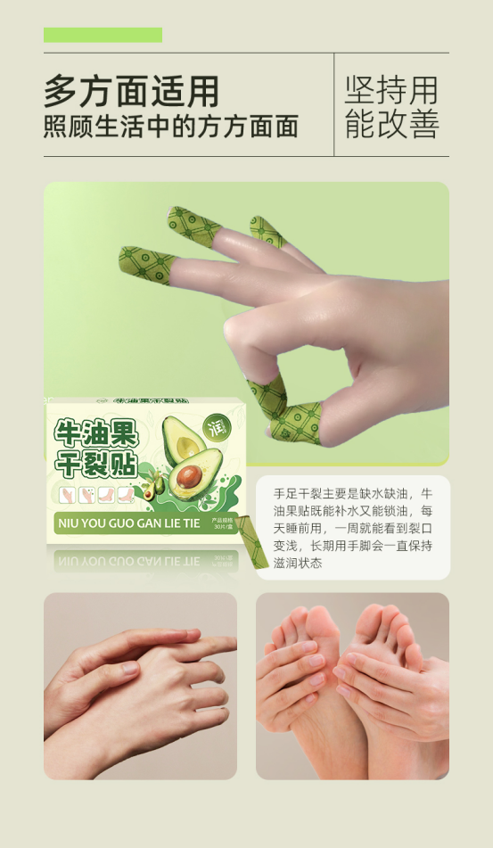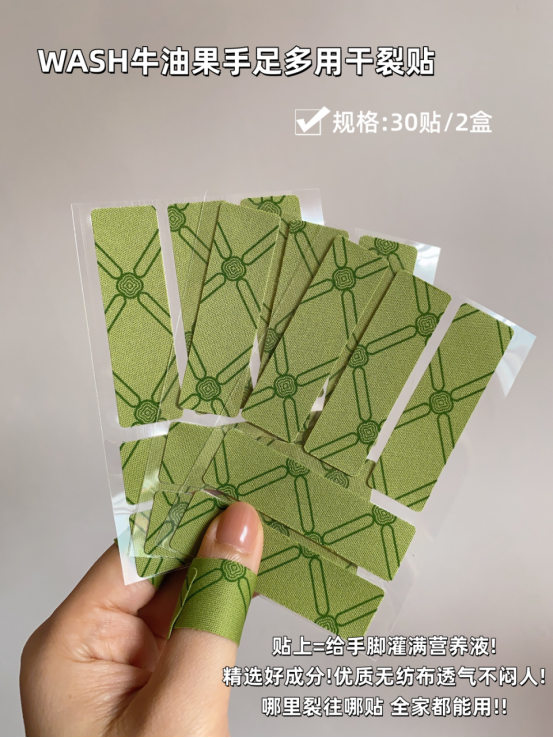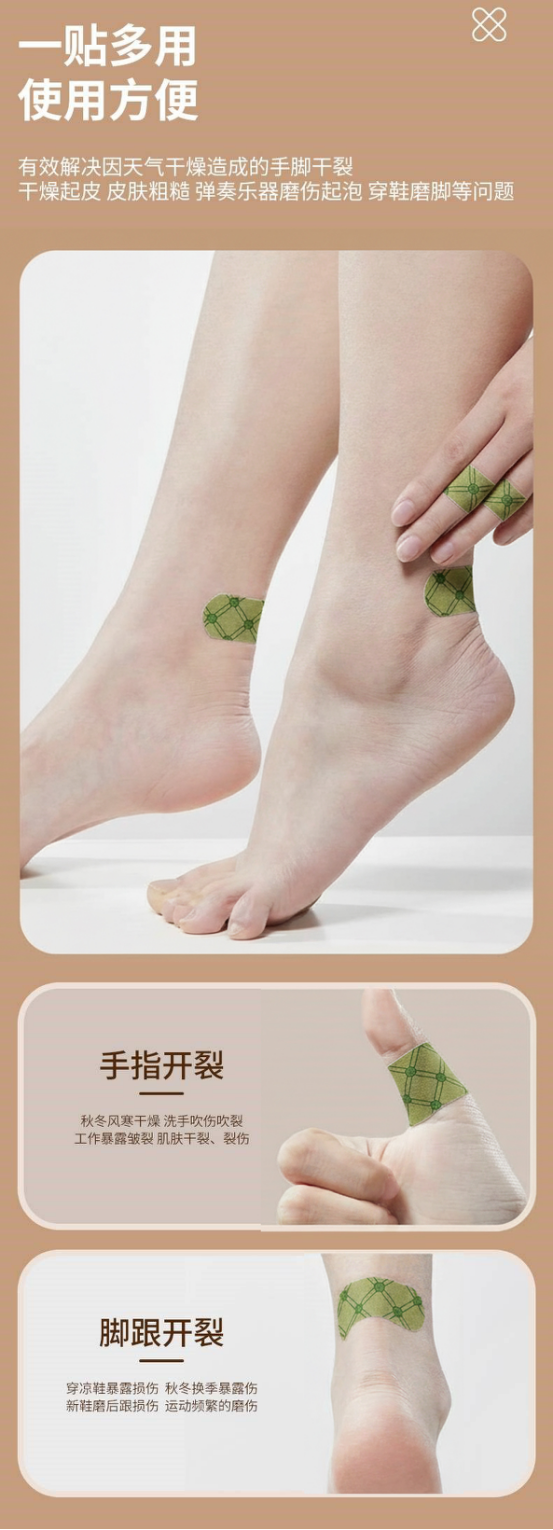 🌿一贴多用,守护每一寸肌肤的柔润🌿 手脚干裂?一指之伤? ✅360°随意弯折,贴合指缝、脚跟、肘部…无死角呵护! ✅强效滋润,深入修护,裂口粗糙一贴缓解! ✅透气隐形,贴牢不掉,工作家务无束缚!