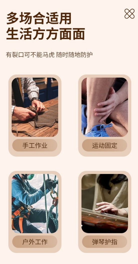 不仅手足裂口、干燥裂口可以用 弹奏乐器、磨伤防护、运动防护、包扎固定都可用 各种因干燥引起的皮肤皲裂、紧绷、粗糙 都能用它!!贴上后伤口恢复速度至少快一倍❗