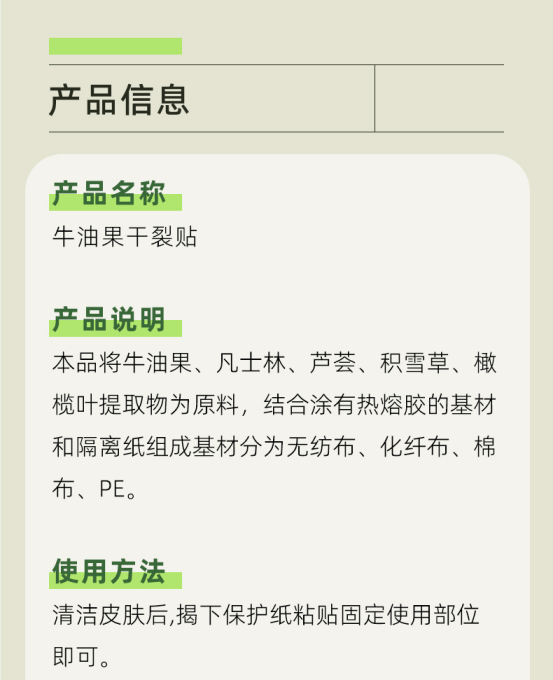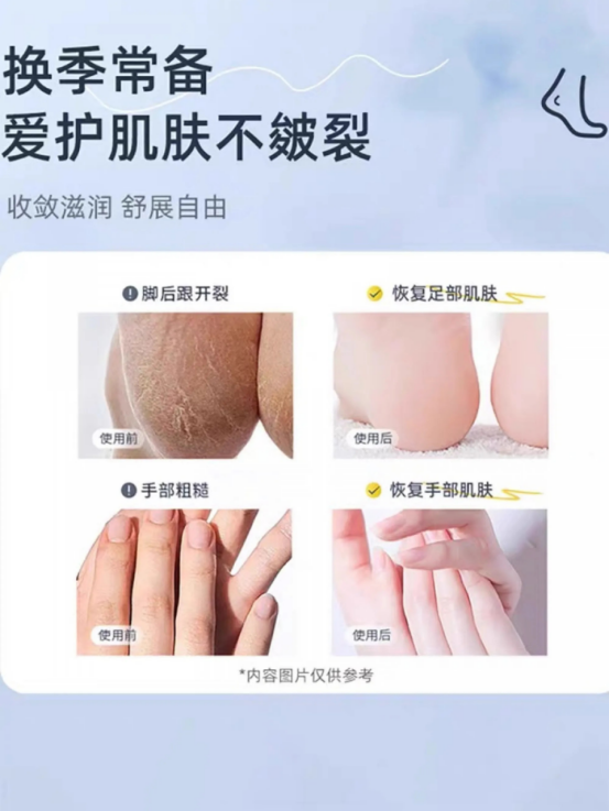 以棉布为基材,亲肤柔软 对裂口有收敛、滋润效果 接触皮肤不刺激 手脚干裂可以放心冲💨