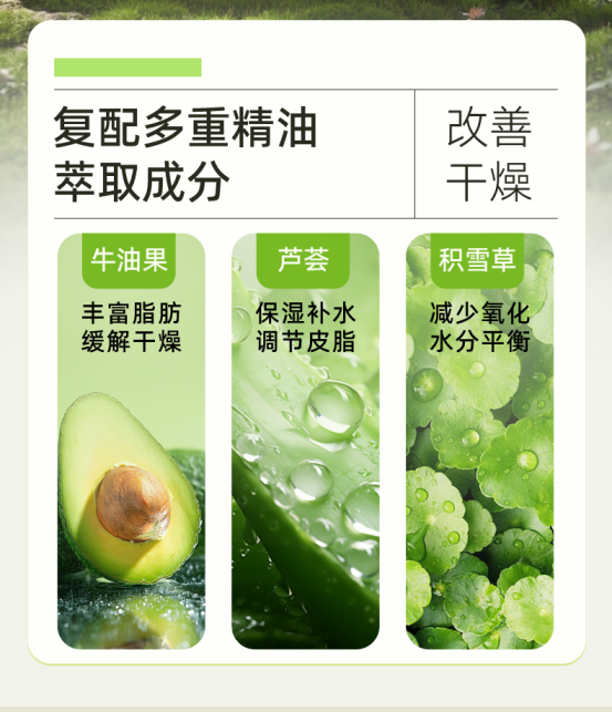 【复配多重精油萃取成分】内含牛油果、凡士林、芦荟、积雪草、橄榄叶提取物,轻松应对干裂和粗糙,舒润肌肤; 成分透入干裂的皮肤深层,是真·修护。 牛油果富含油酸等脂肪酸,能快速渗透皮肤,形成天然保护层,减少水分流失,缓解干燥和粗糙感。 其中维生素E和谷胱甘肽等成分可加速帮助愈合裂口修护。