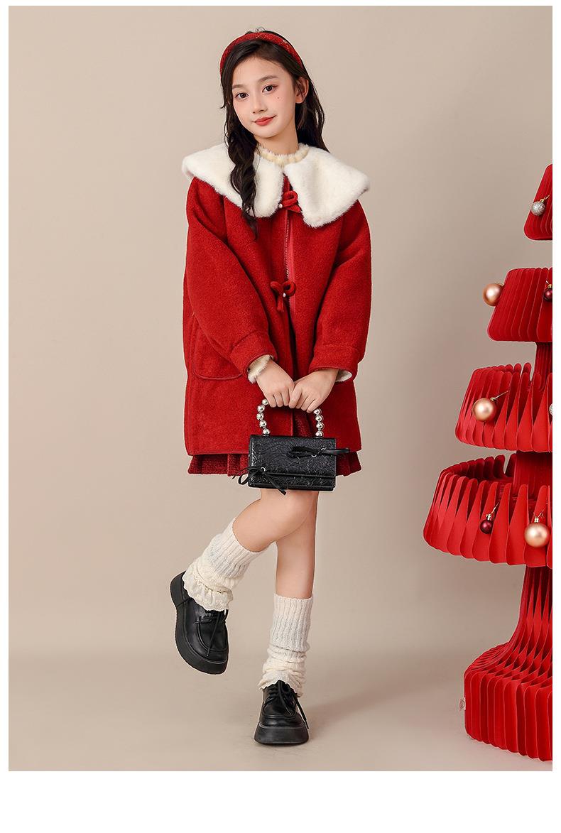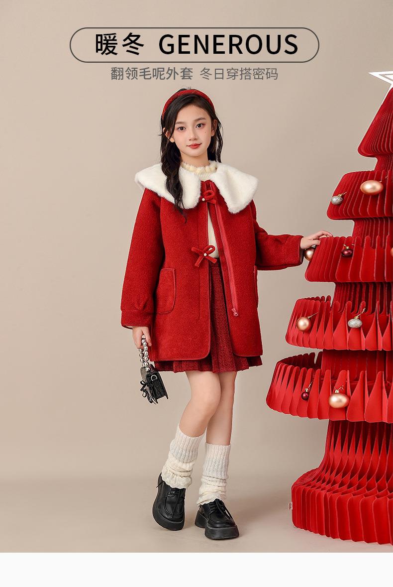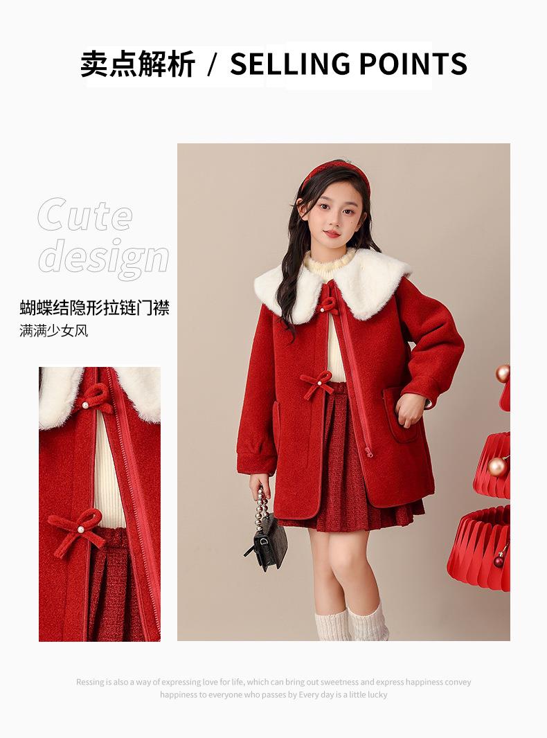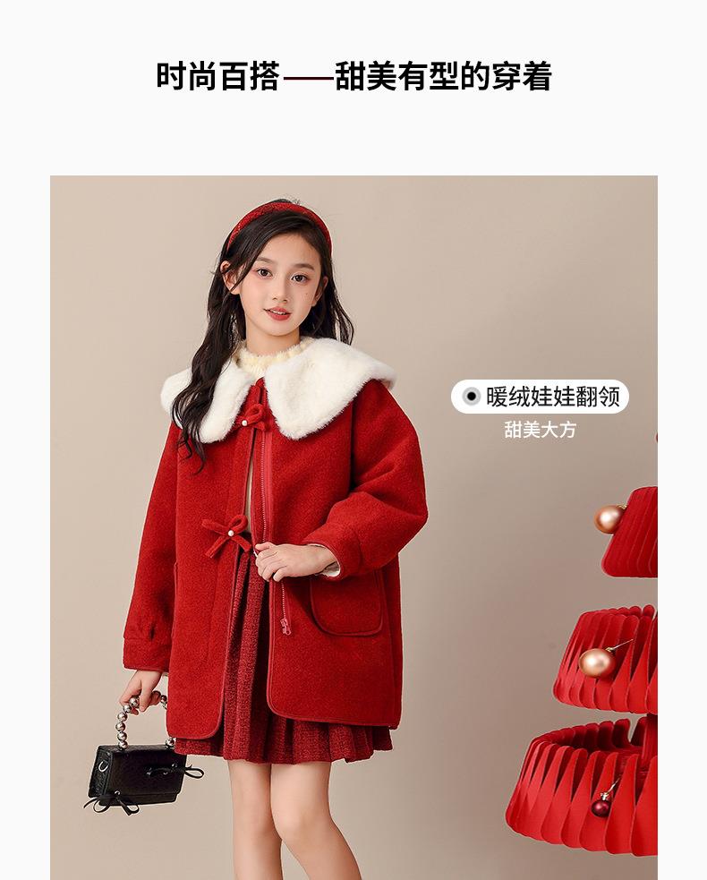 女孩外套新款女童冬装洋气加绒拜年服儿童呢子大衣新年红色中长款