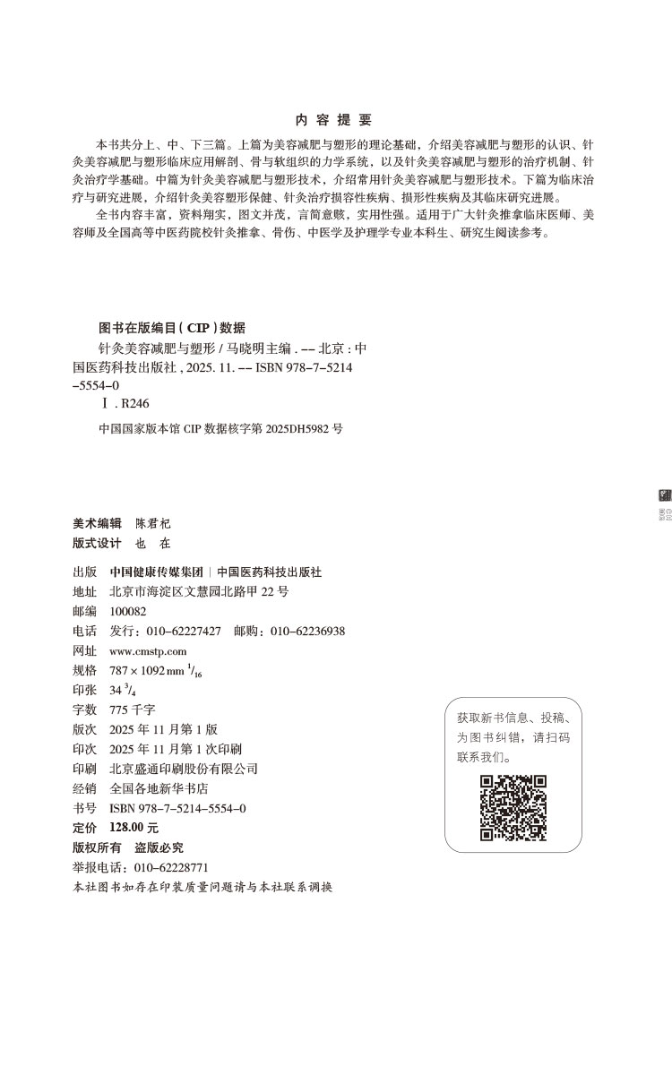 针灸美容减肥与塑形 马晓明 主编 适用于广大针灸推拿临床医师 骨伤 中医学及护理学专业本科生 研究生阅读参考中国医药科技出版社