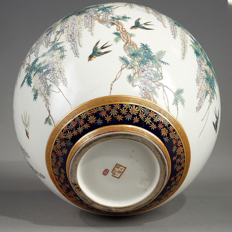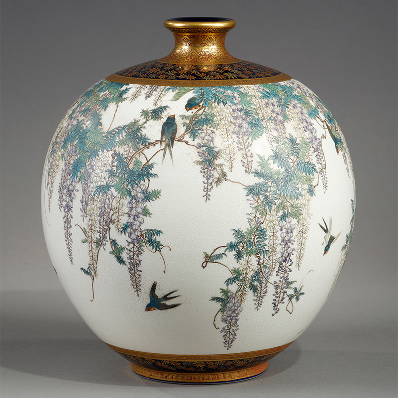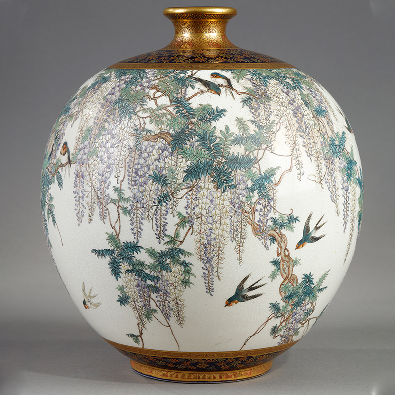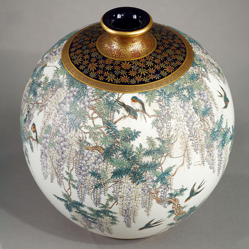 1890-1900年代日本明治时期出品「紫藤飛燕図」主题錦光山造款金彩枫叶纹萨摩烧装饰花瓶