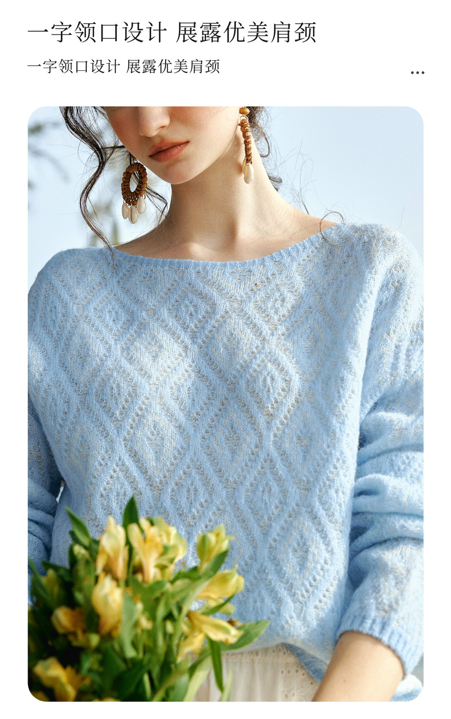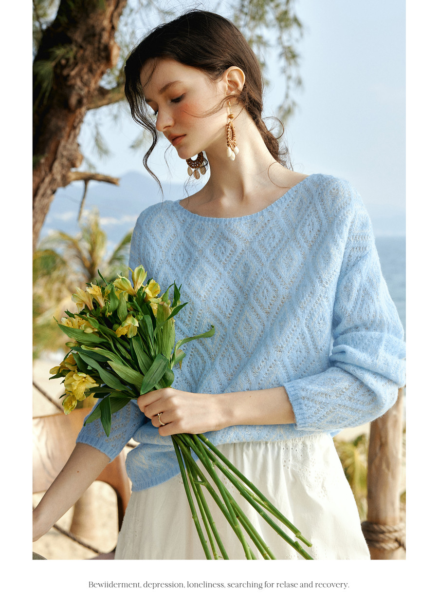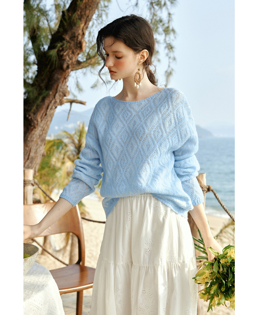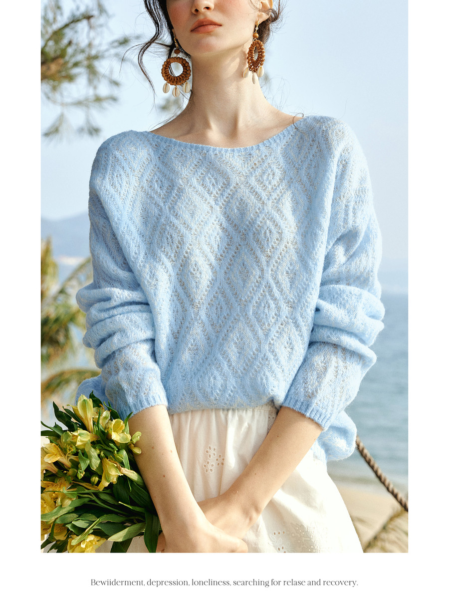 欧芮儿2026春新款蓝色菱格提花套头毛衣法式慵懒风一字领毛针织衫