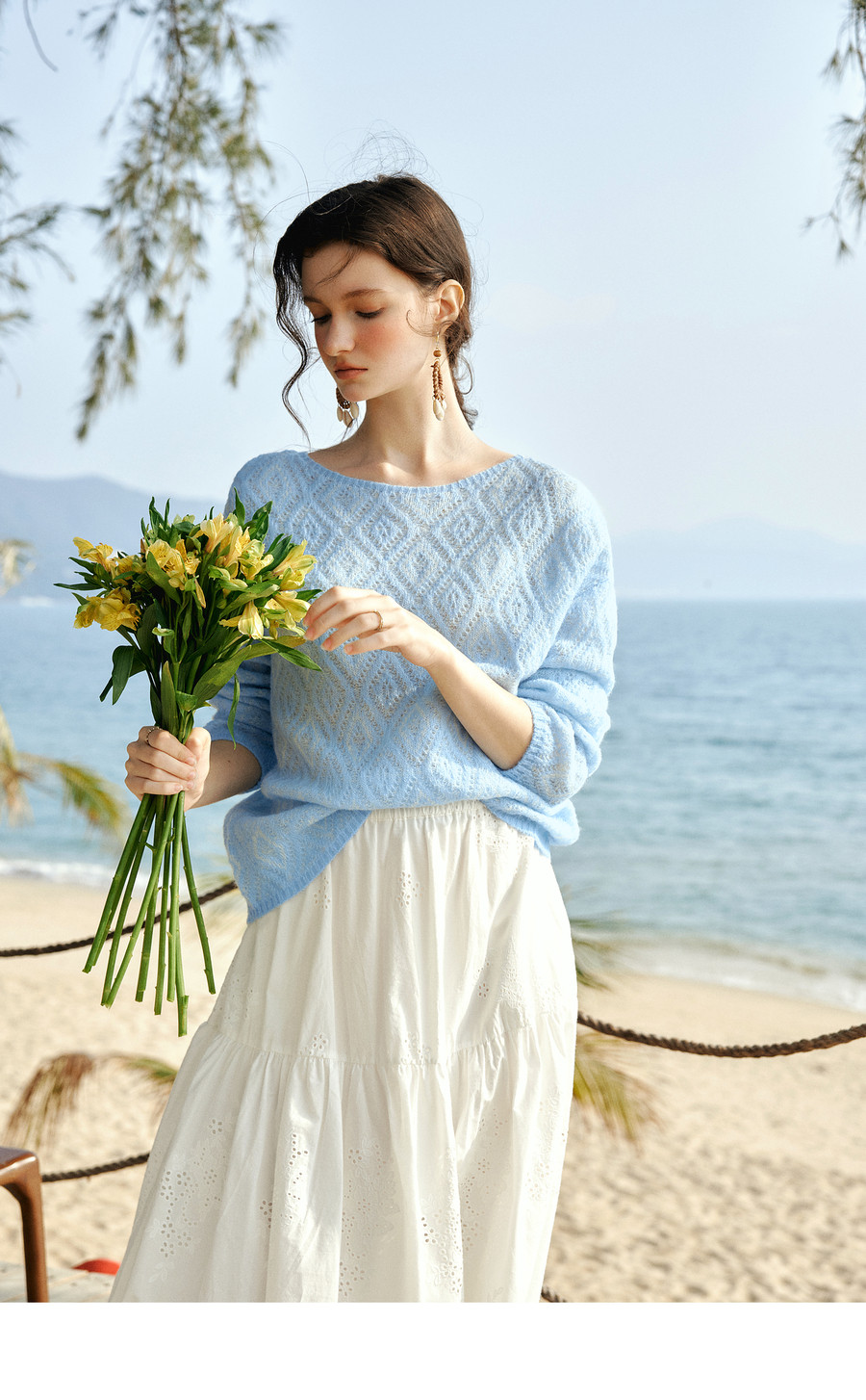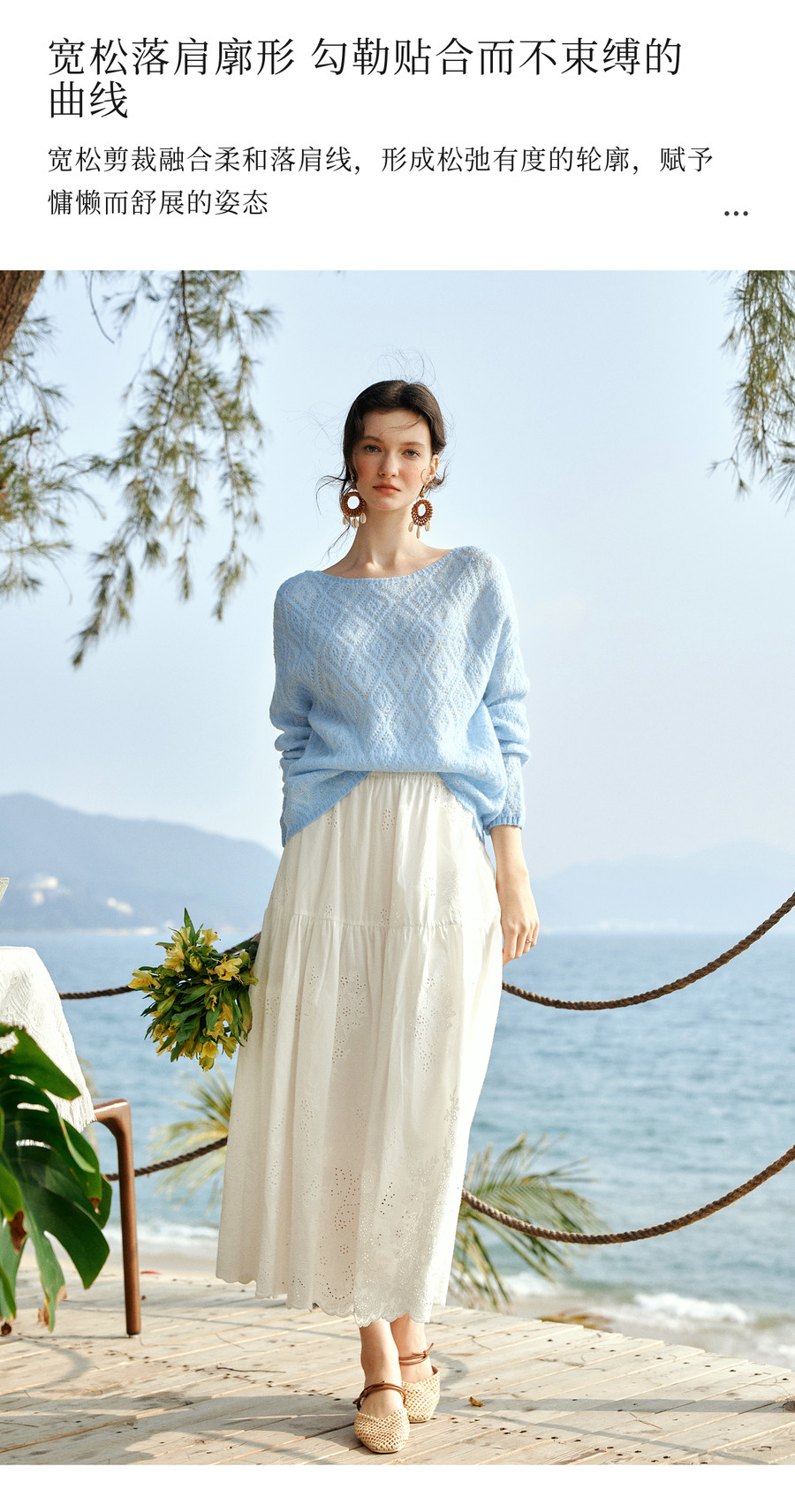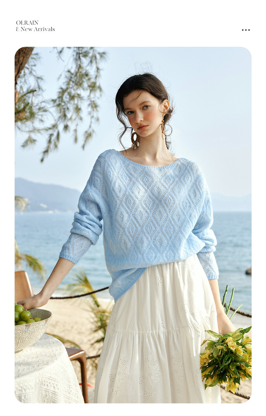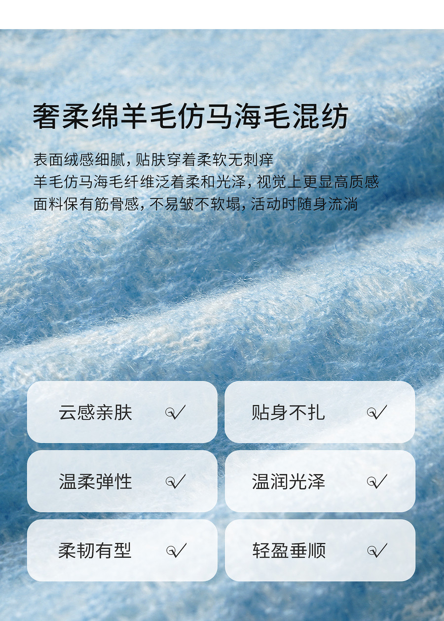 欧芮儿2026春新款蓝色菱格提花套头毛衣法式慵懒风一字领毛针织衫