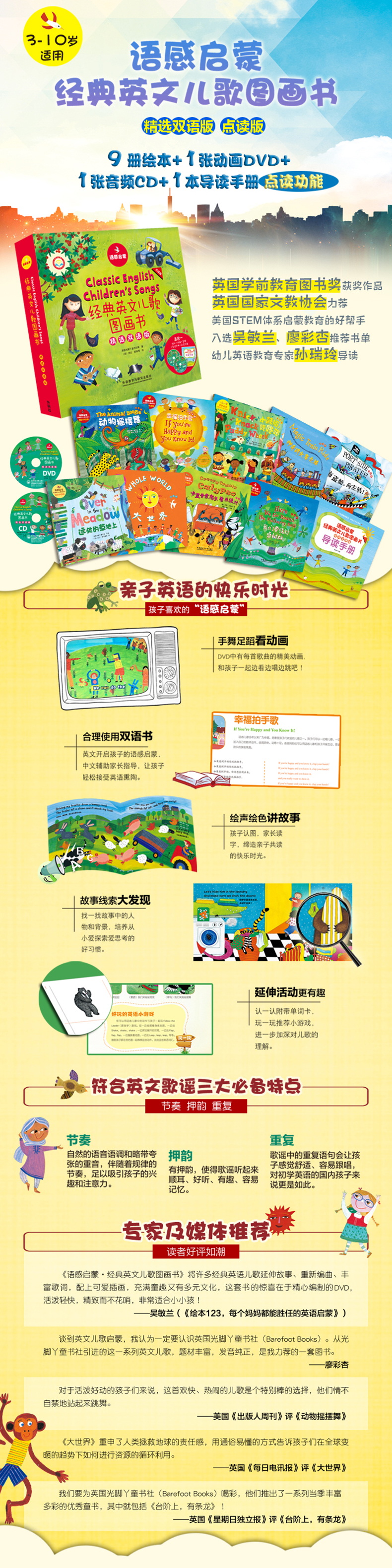 《语感启蒙:经典英文儿歌图画书(精选双语版)》由外研社实用英语工作室·英语启蒙工作组引自英国光脚丫童书社,涵盖摇摇摆摆韵律歌、环游世界去冒险、动物王国大联欢三个深受孩子喜爱的主题,融合9本图画书、儿歌音频、动画视频和点读功能,并邀请资深幼儿英语教育专家孙瑞玲老师编写导读手册,紧密结合国内孩子英语学习的特点,方便家长亲子指导和教师课堂教学。
