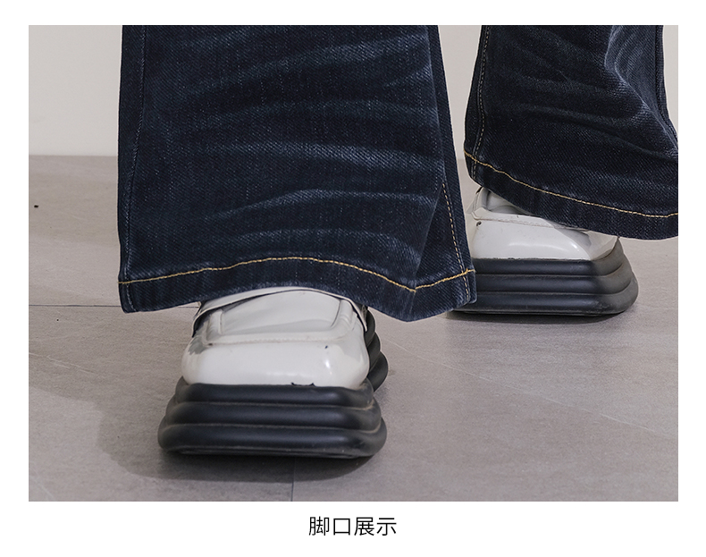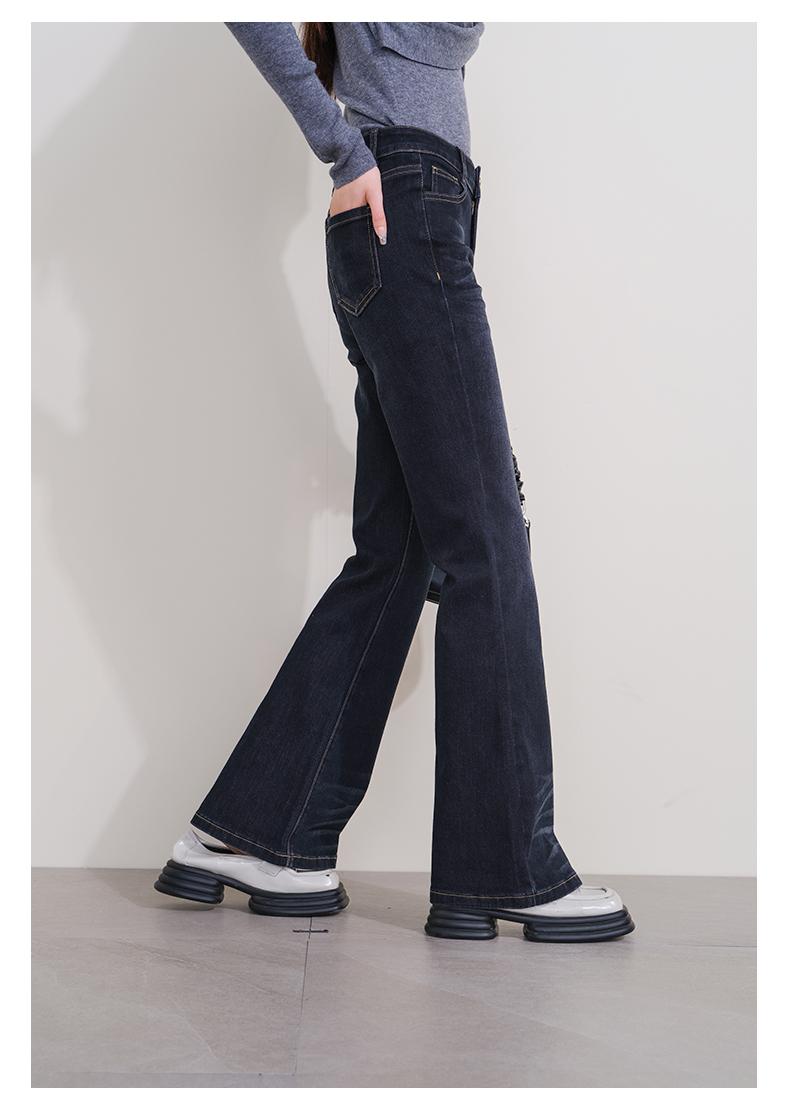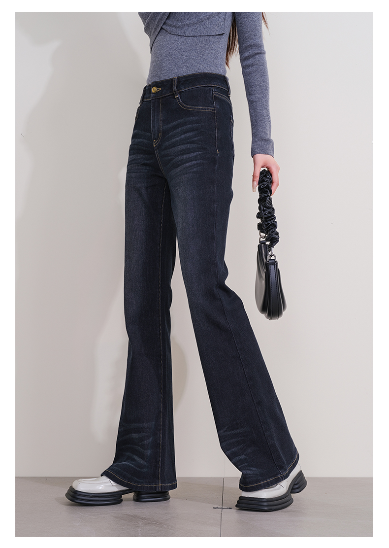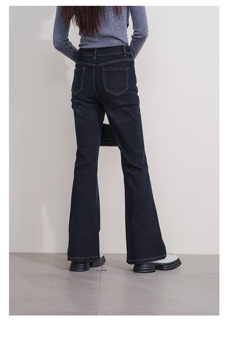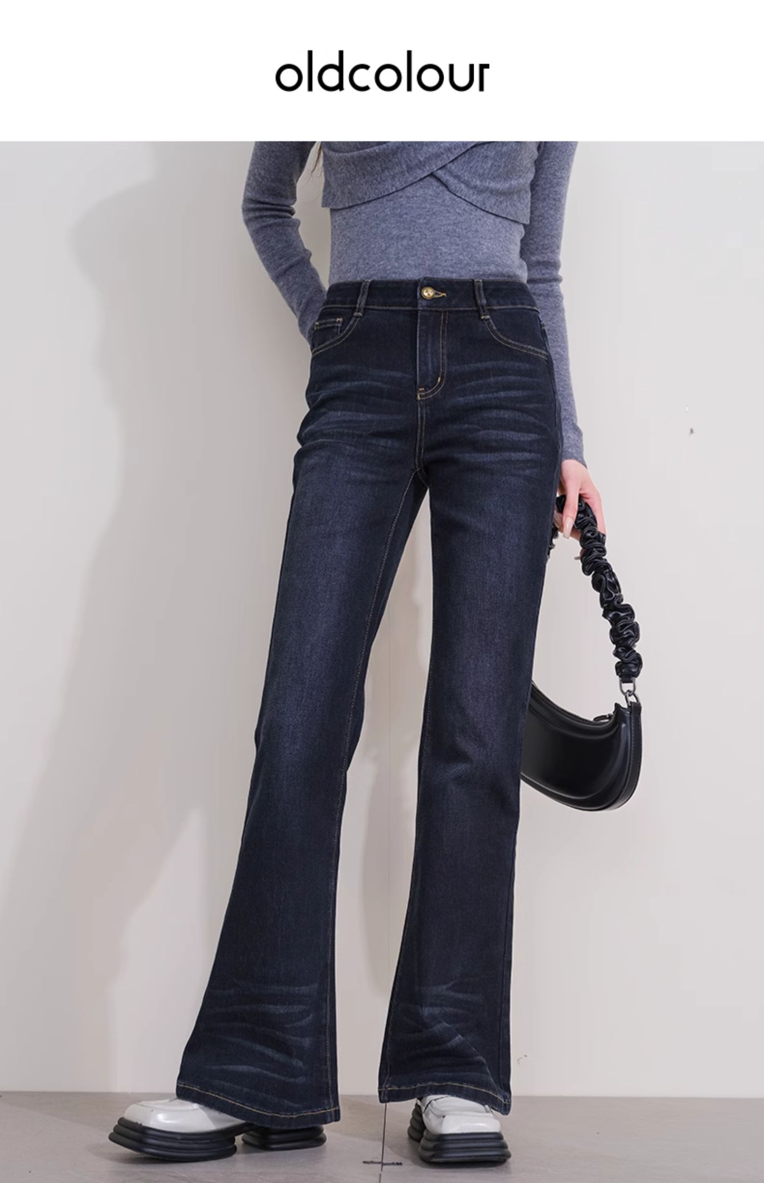 oldcolour冬季新款深蓝色复古气质高腰百搭微喇牛仔裤女P431104A1