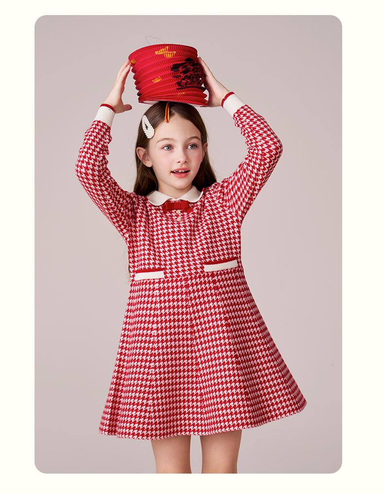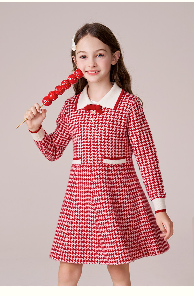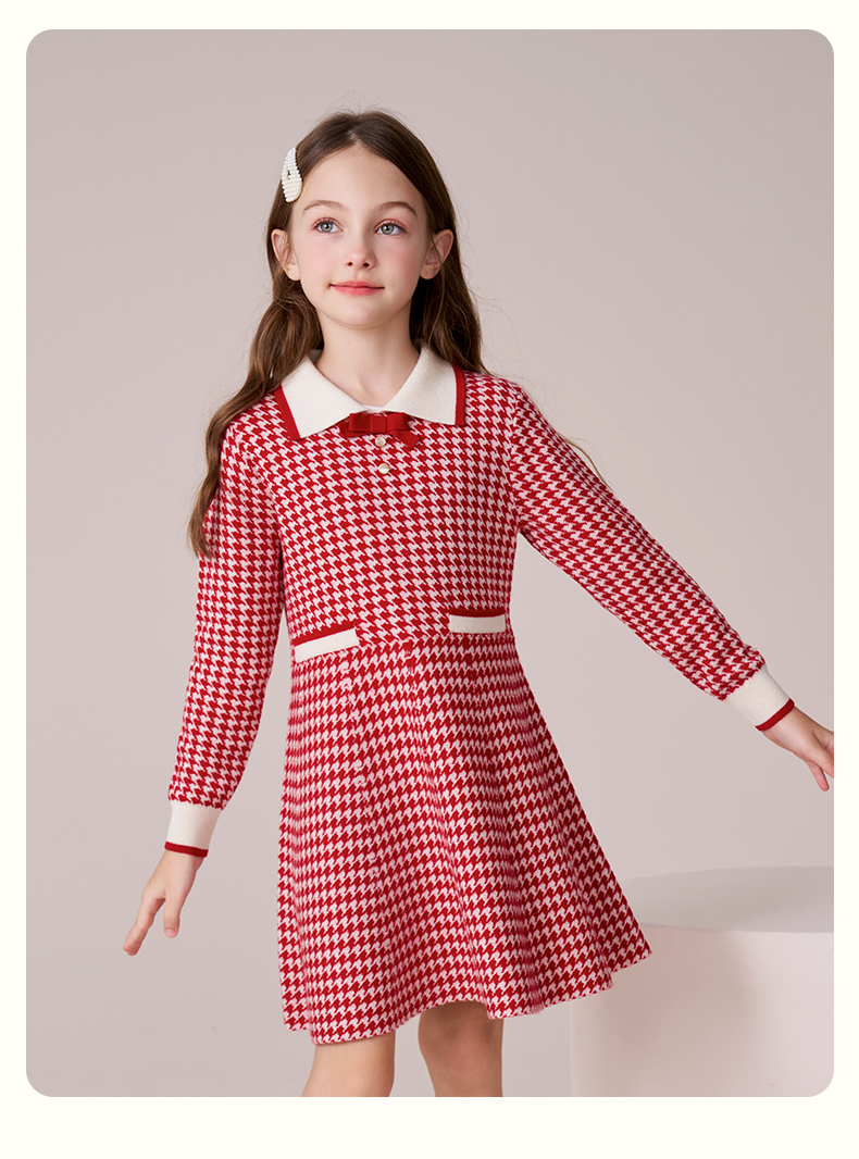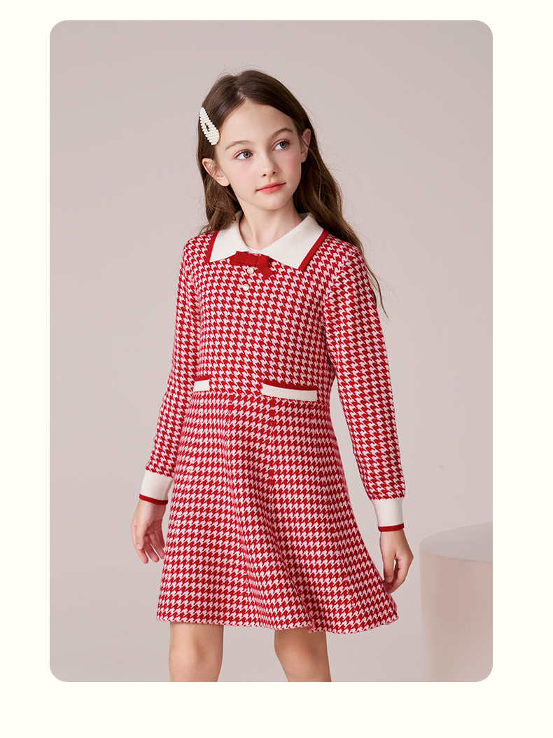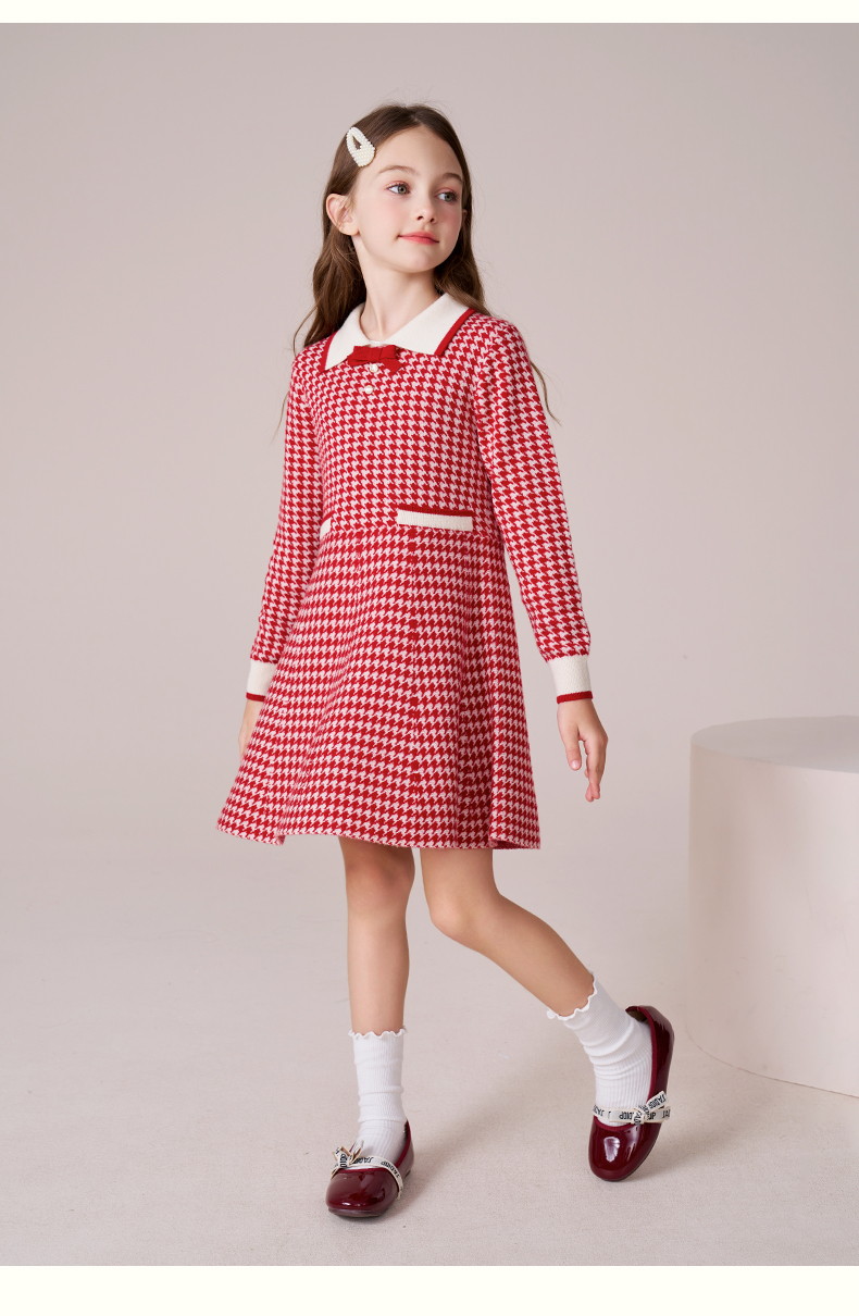 女童羊毛连衣裙2023秋冬新款加厚裙子儿童红色长裙千鸟格公主裙