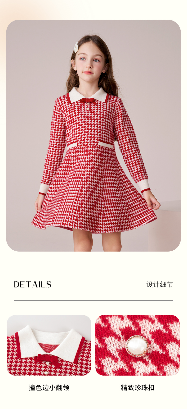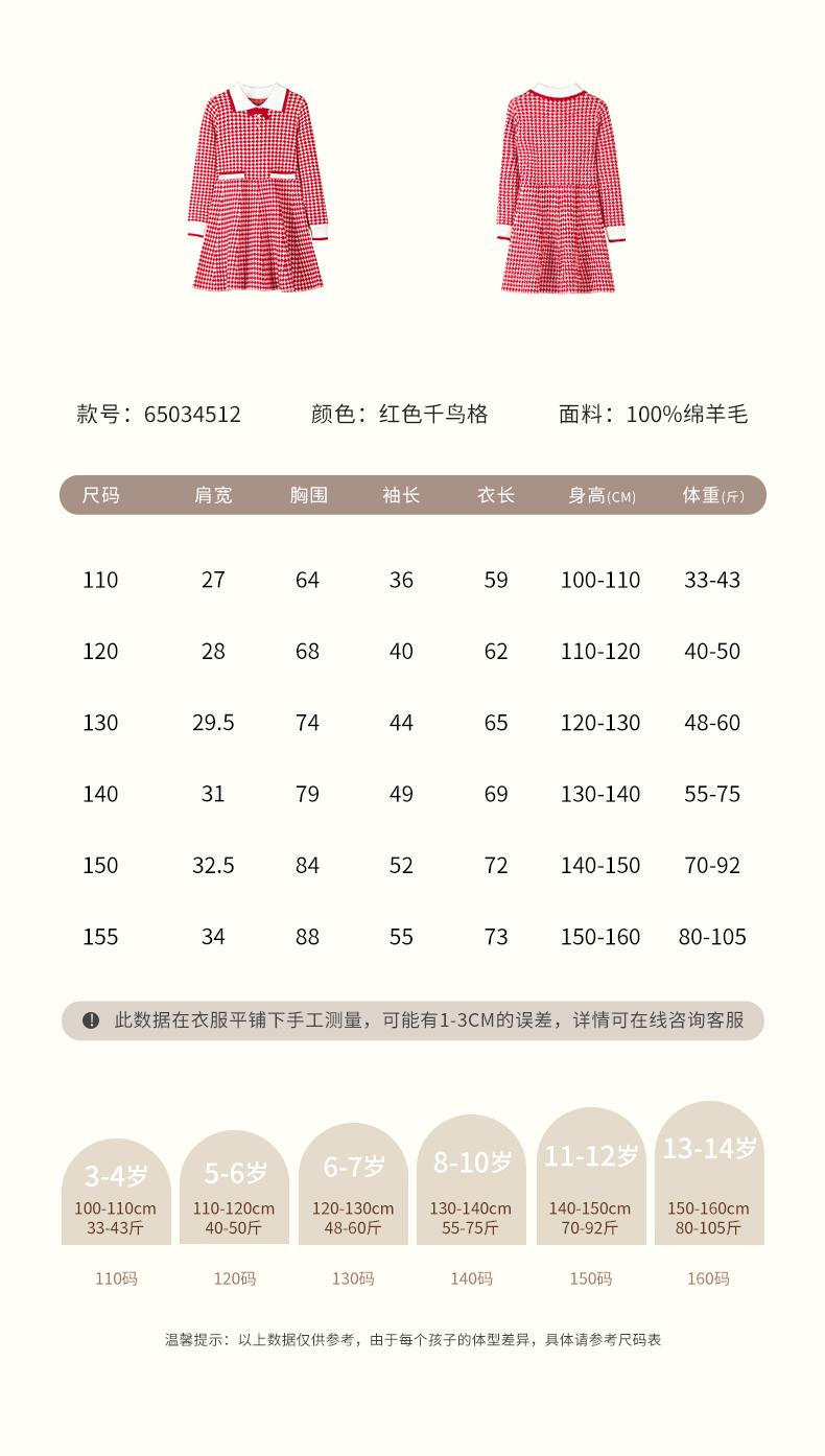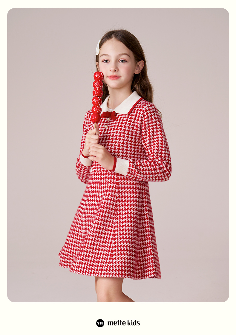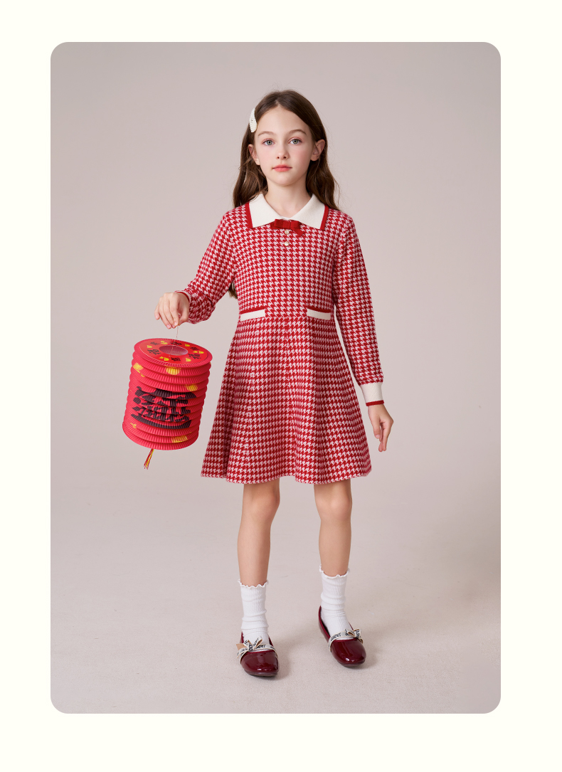 女童羊毛连衣裙2023秋冬新款加厚裙子儿童红色长裙千鸟格公主裙