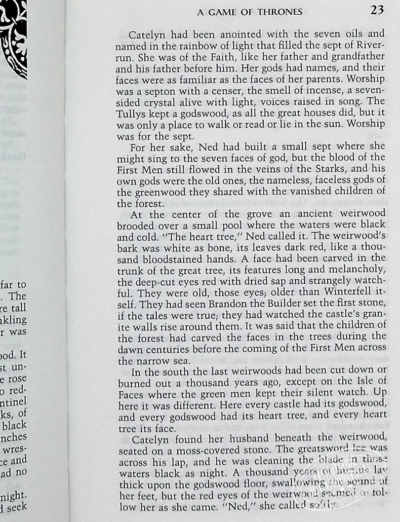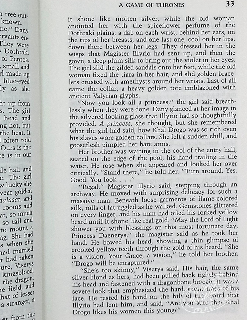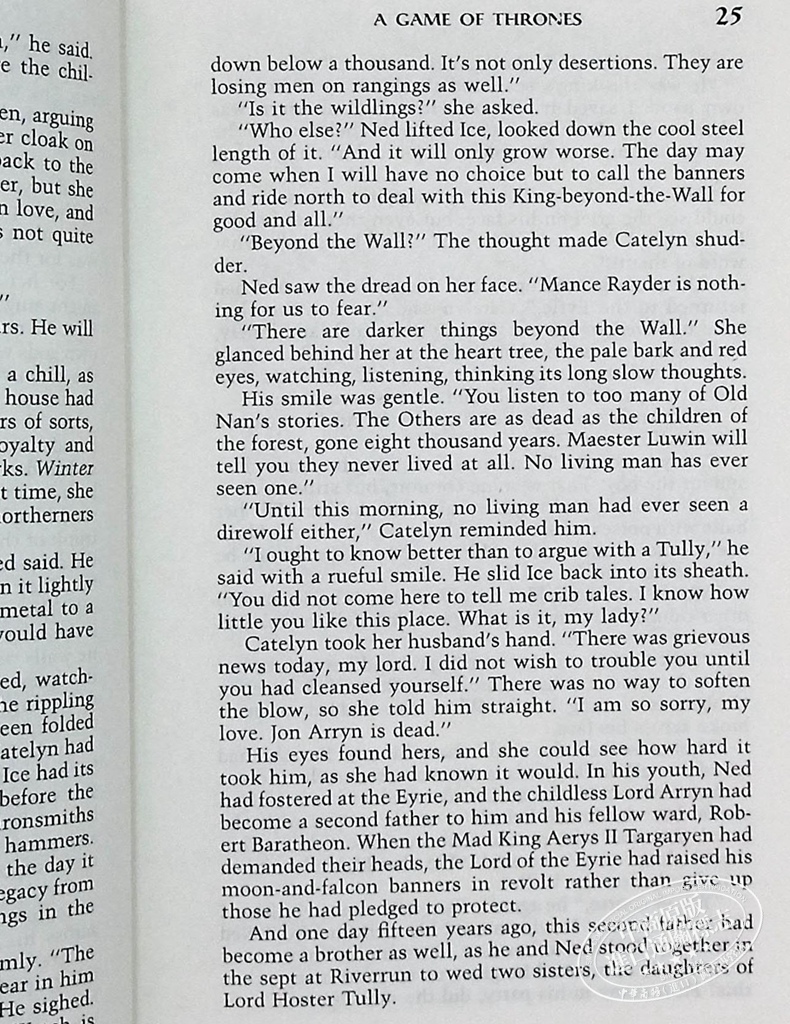 《冰与火之歌》(A Song of Ice and Fire)是由美国知名科幻奇幻小说家乔治·R·R·马丁(George R.R. Martin)所著的史诗奇幻小说,是当代奇幻文学一部影响深远的里程碑式的作品。于1996年初问世时,便以别具一格的结构、浩瀚辽阔的视野、错落有致的情节和生动活泼的语言,迅速征服了欧美文坛。作品主要描述了在一片虚构的中世纪大陆上所发生的一系列相互联系的宫廷斗争、疆场厮杀、游历冒险和魔法抗衡的故事,全书七卷(已出版到第五卷)浑然一体,共同组成了一幅壮丽而完整的画卷。