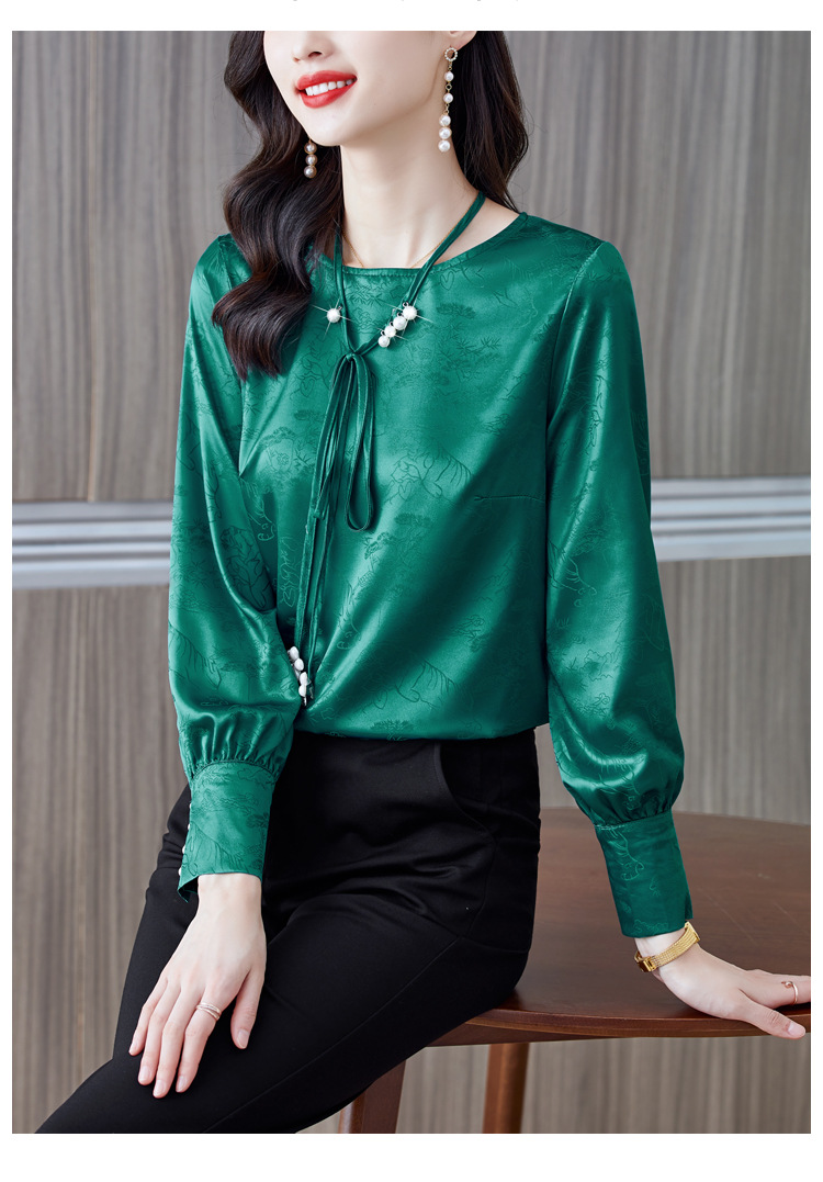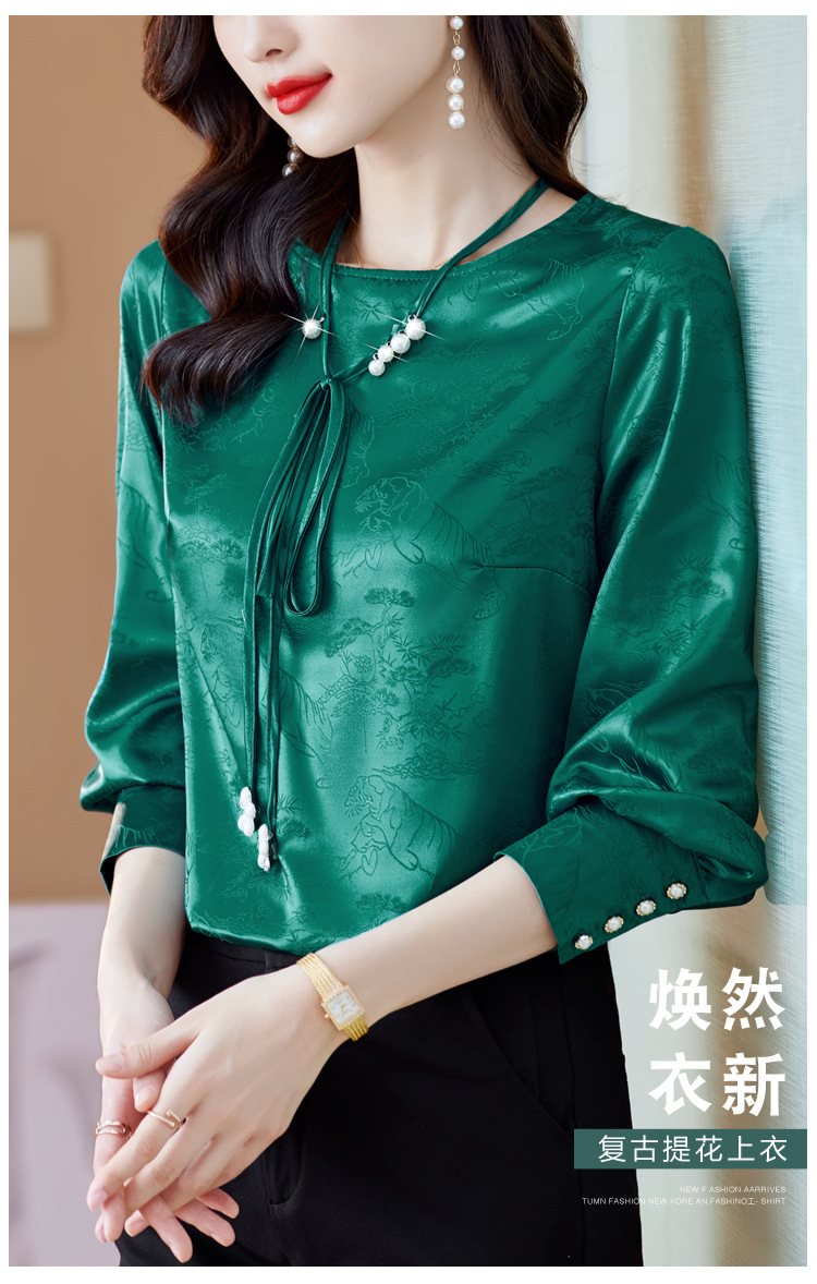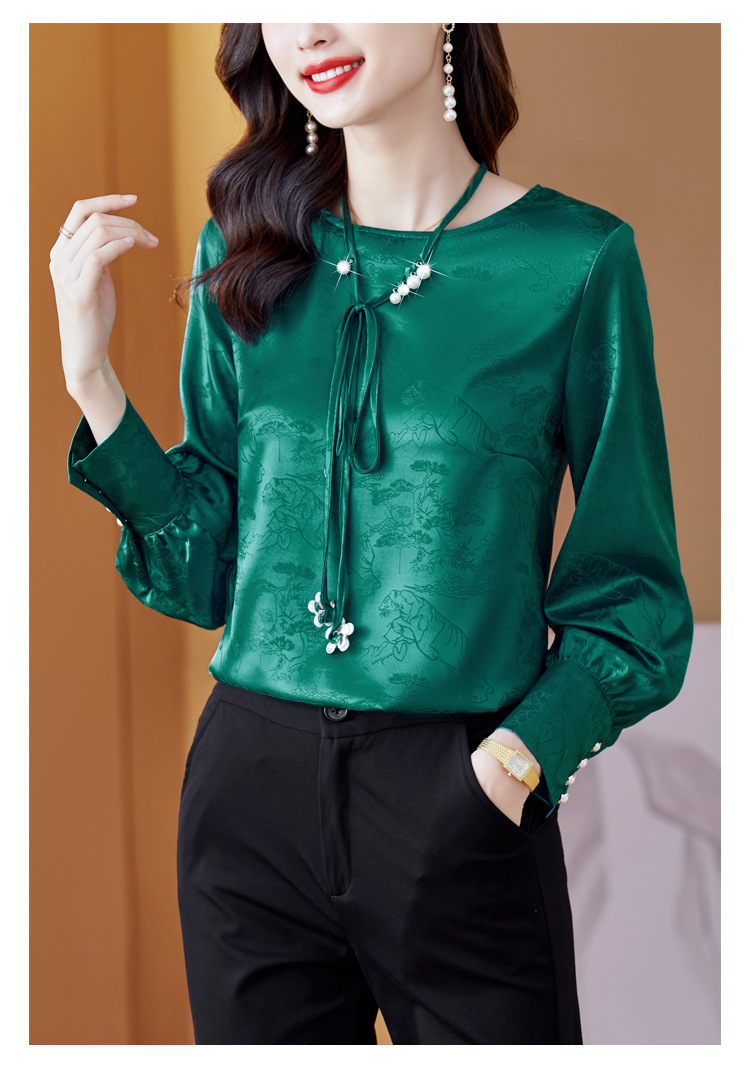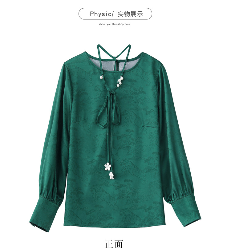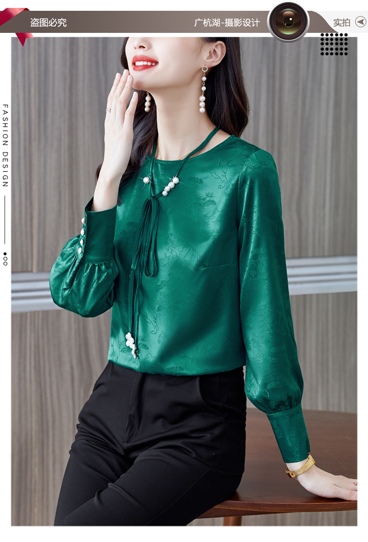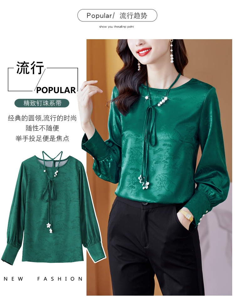法式复古,圆领钉珠系带休闲提花仿真丝衬衫KQL-861