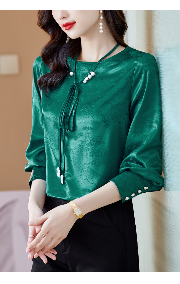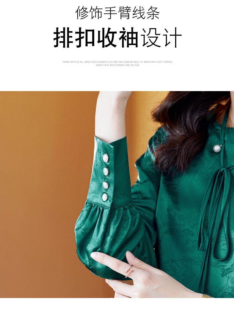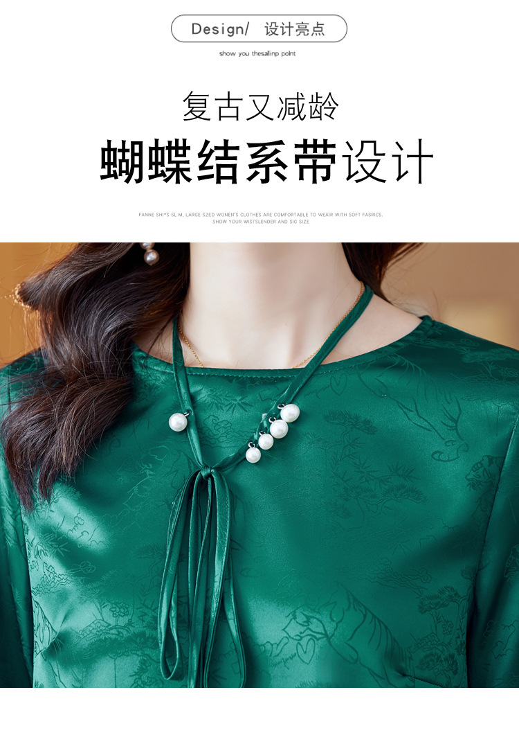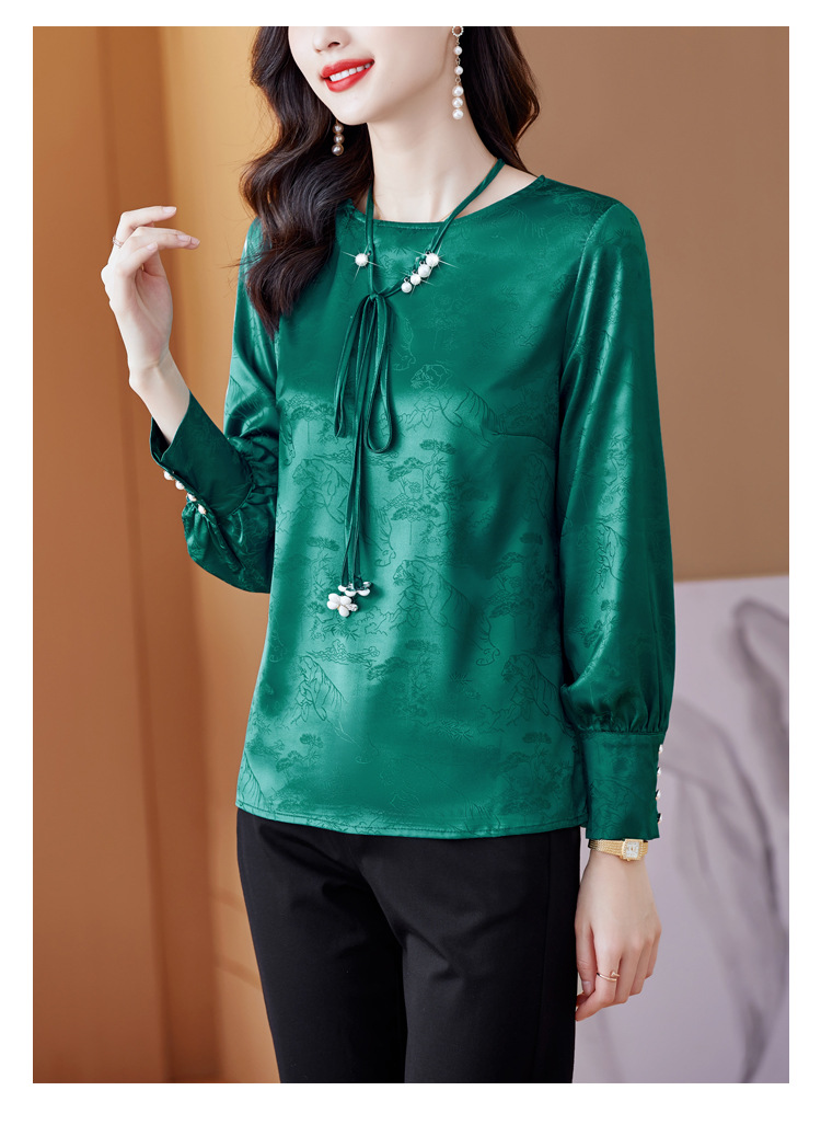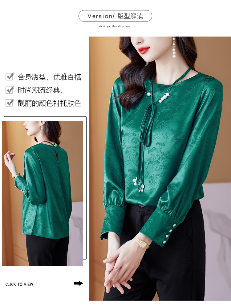 法式复古,圆领钉珠系带休闲提花仿真丝衬衫KQL-861