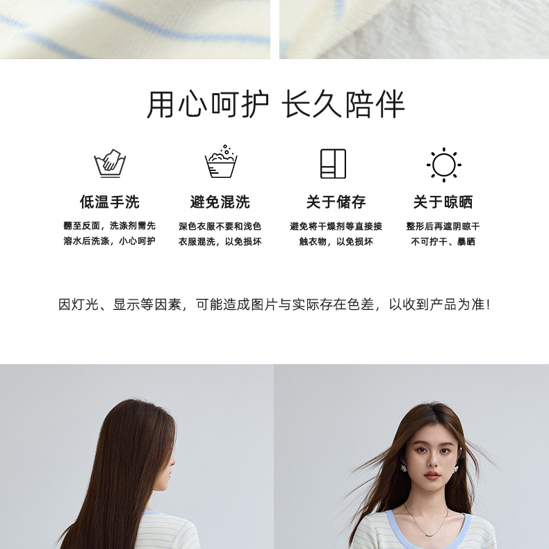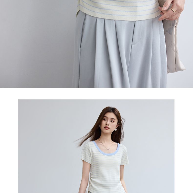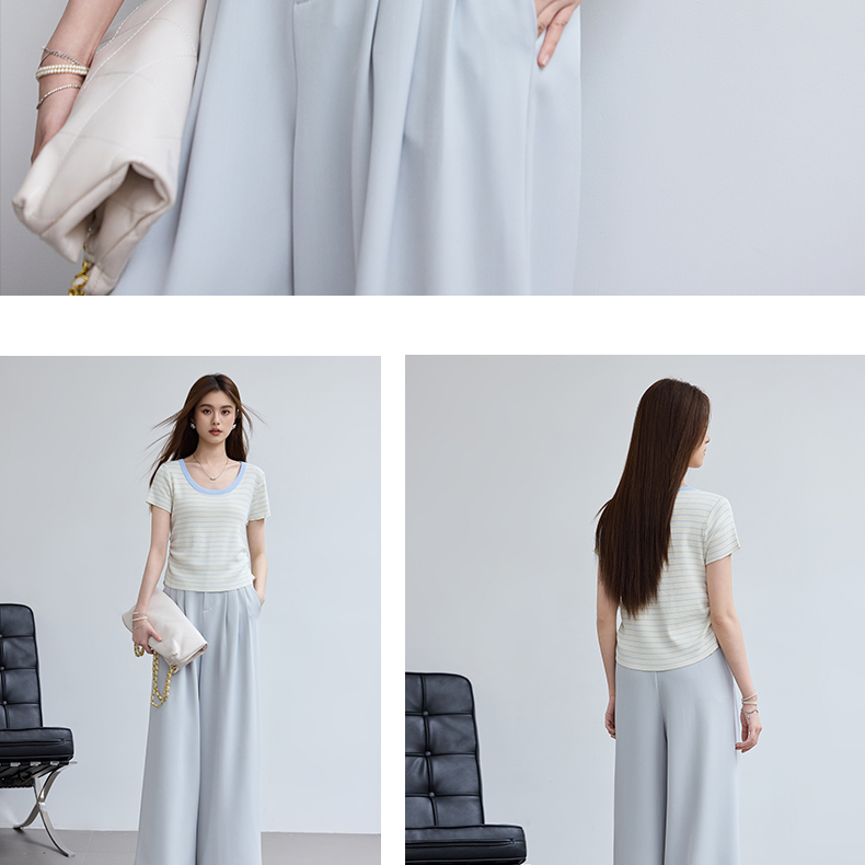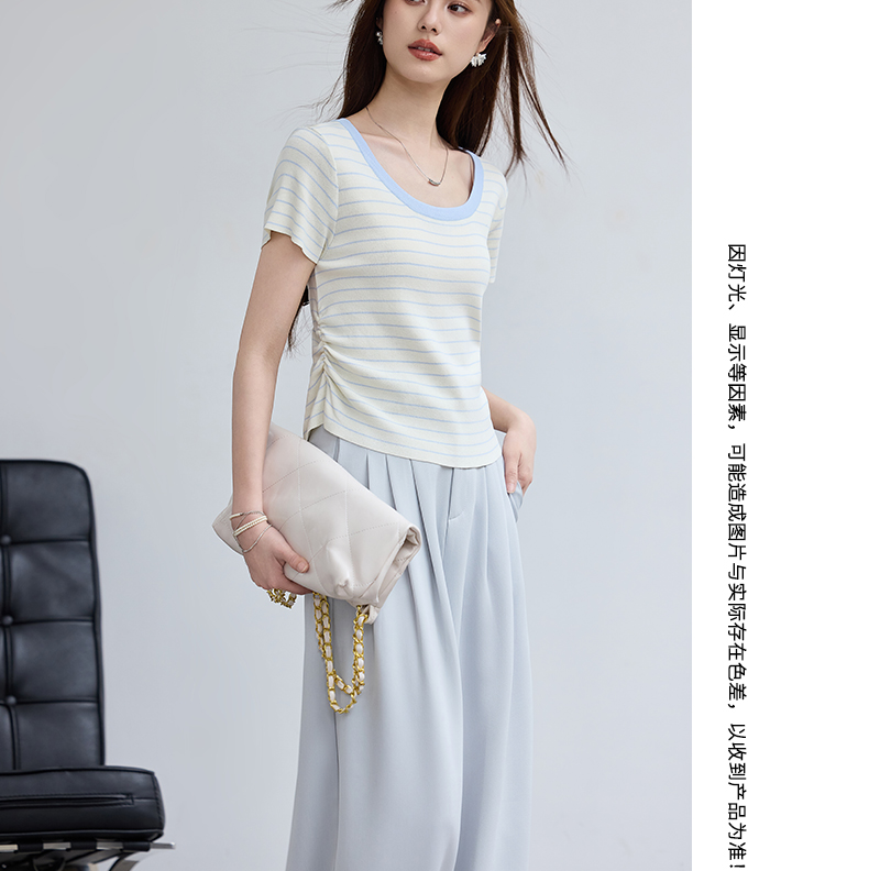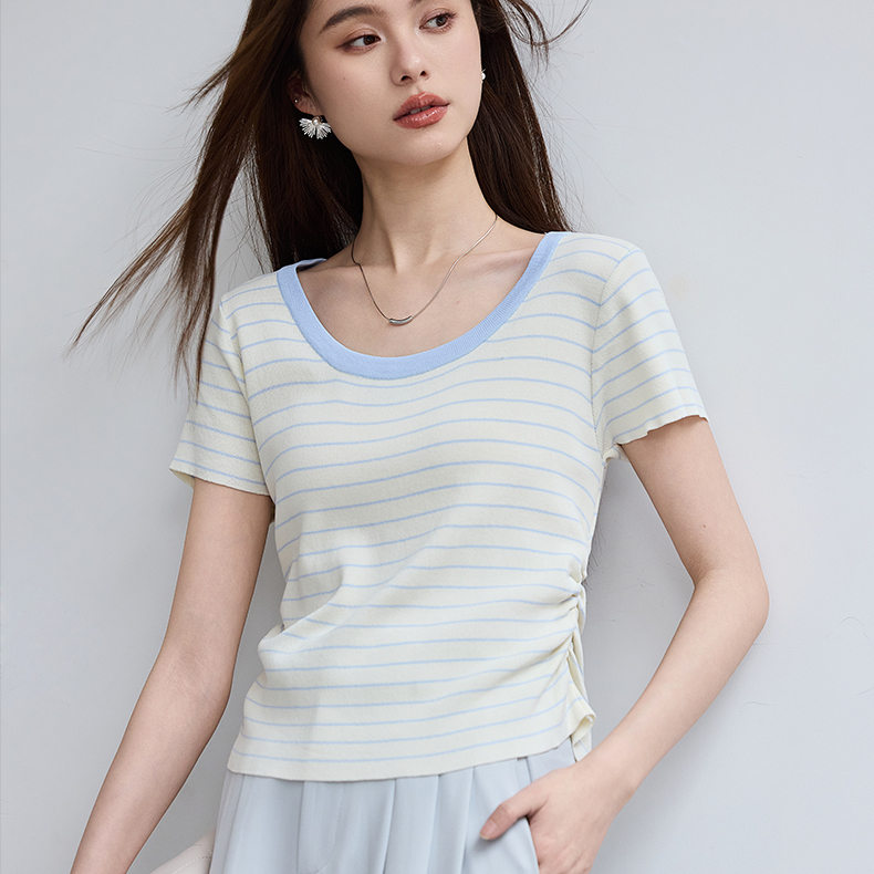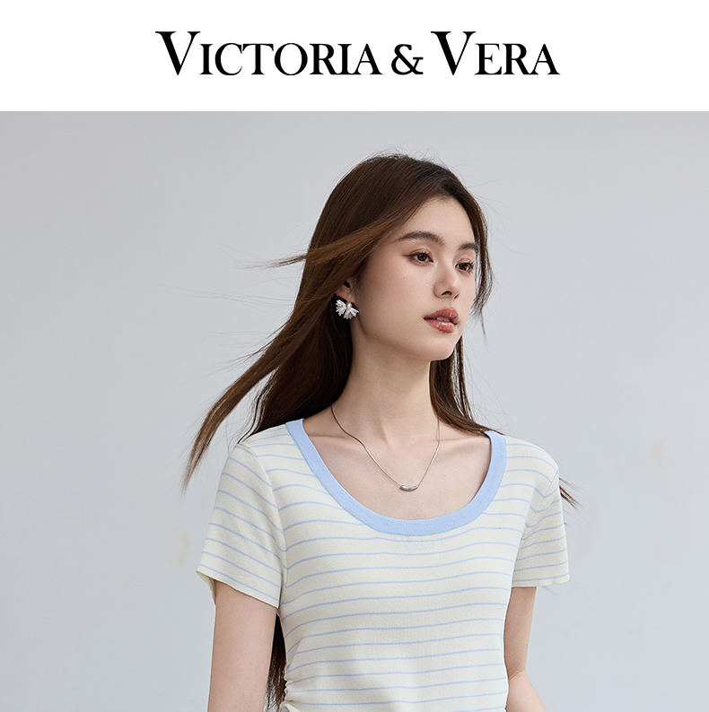VICTORIA&VERA夏季“月汐刻度”韩版小清新设计感横条收腰短袖针织衫