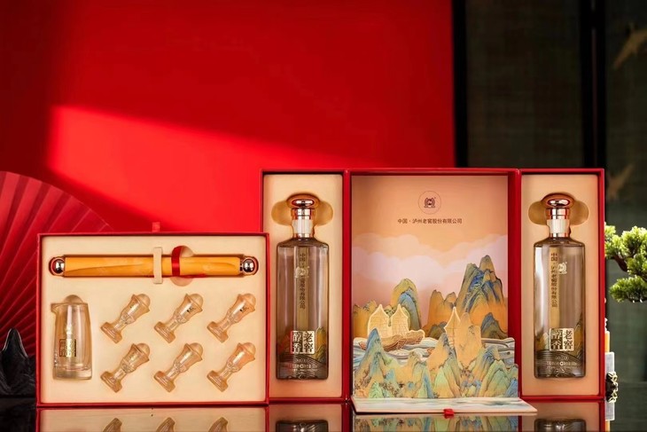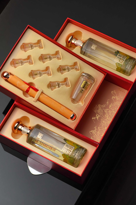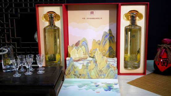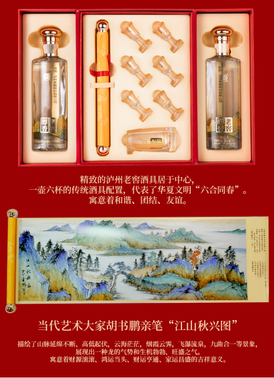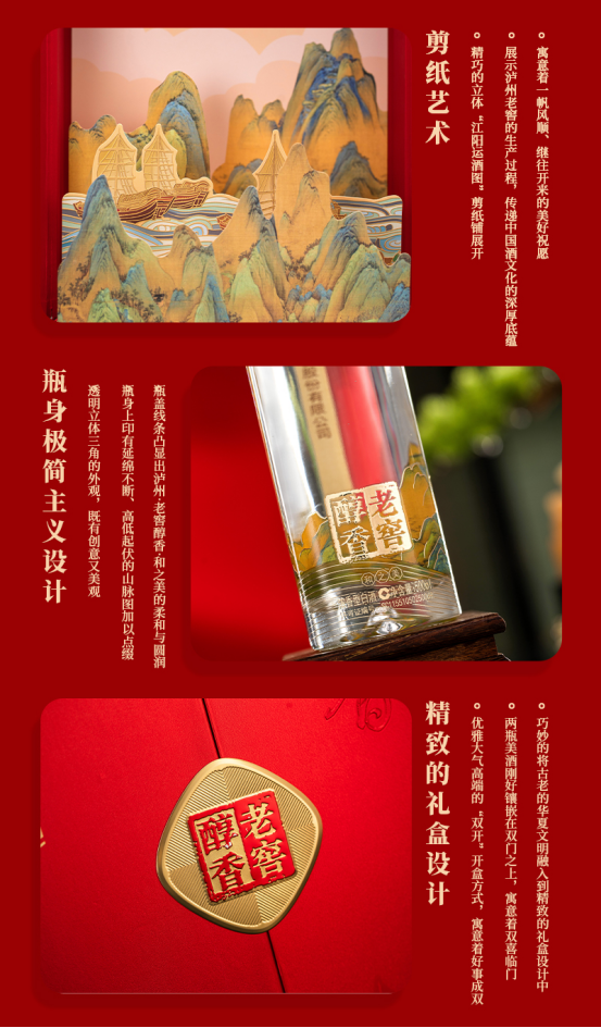 产品卖点: ①外观:以大红色为主色调,红色作为中国文化中的吉祥、繁荣和幸运的象征。寓意表着好运、祝福和喜庆。 红如烈火照前程,前程似锦步步高 ②“和之美”表达的是人与自然、人与人之间的和谐美好关系,不仅体现了泸州老窖高尚、纯洁、优雅的品牌理念,更是表达出泸州老窖对和大家和和美美,自然和谐的美好祝愿。 ③泸州 老窖醇香 和之美巧妙的将古老的华夏文明融入到精致的礼盒设计中。优雅大气高端的开盒方式,两边同时拉开的开盒方式为“双开”,寓意着好事成双,两瓶美酒刚好镶嵌在双门之上,寓意着双喜临门,同时也分别代表着“和谐”与“美好”。 ④礼盒还配备了精致的泸州老窖酒具居于中心,一壶六杯的传统酒具配置,代表了华夏文明“六合同春”。寓意着和谐、团结、友谊。 ⑤酒具礼盒中镶嵌着当代艺术大家胡书鹏亲笔“江山秋兴图”描绘了山脉延绵不断、高低起伏,云海茫茫,烟霞云霁,飞瀑流泉,九曲合一等景象,展现出一种龙的气势和生机勃勃、旺盛之气。寓意着财源滚滚、鸿运当头、财运亨通、家运昌盛的吉祥意义。秋兴无限,江山如画。 ⑥剪纸艺术:拿出礼盒酒具,里面别有洞天,精巧的立体“江阳运酒图”剪纸铺展开来,把整个礼盒的高级感瞬间拉满,给人强烈的视觉震撼,江阳运酒图描绘的是古代泸州江阳地区酿酒、运酒的场景,将其巧妙的融入到中国传统剪纸艺术中去,既展示了泸州老窖的生产过程,也传递了中国酒文化的深厚底蕴。寓意着一帆风顺、继往开来的美好祝愿。 ⑦瓶身采用极简主义,做的是透明立体三角的外观,正面写着“中国泸州老窖股份有限公司”表明身份,透过酒体酒质几个大字依然清晰可见,既有创意又美观,瓶身上面印有延绵不断、高低起伏的山脉图加以点缀,瓶盖上面的线条也凸显出泸州 老窖醇香 和之美的柔和与圆润,整体简约又不失雅致,圆润柔和之美尽显其中。简约而不简单,别致而不繁复。 老窖醇香和之美背面江阳运酒图更是少有的五星标,代表其超越的品质和卓越的地位
