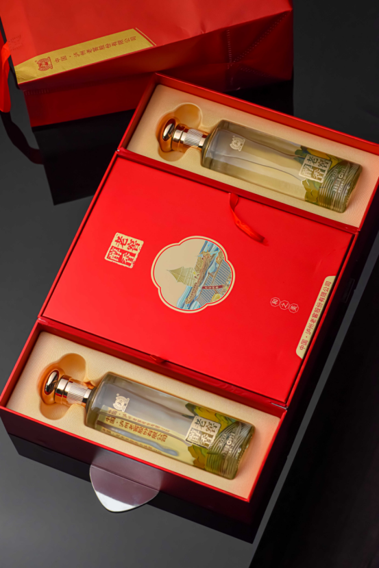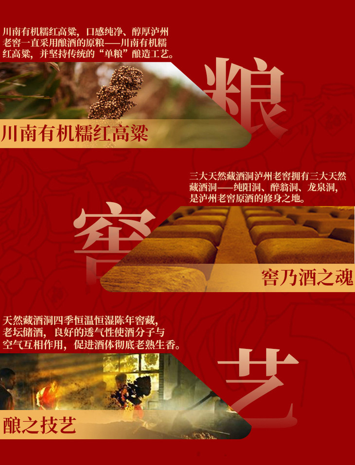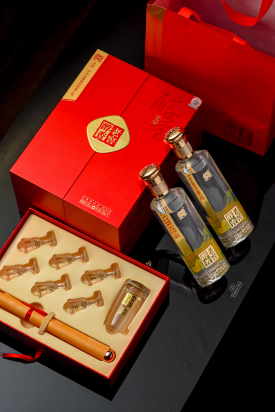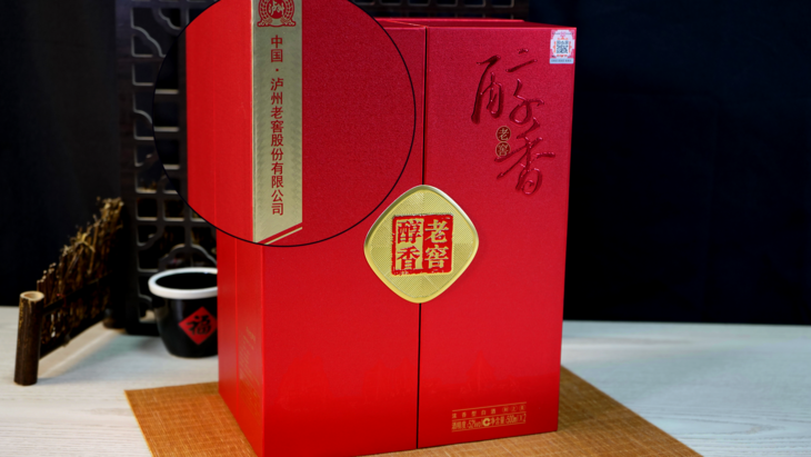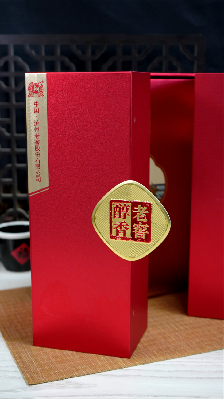 泸州老窖老窖醇香和之美,红色礼盒,金色点缀,大气喜庆(红为喜,金为贵)。