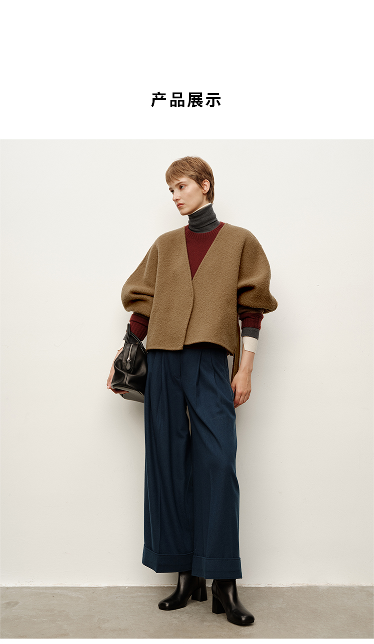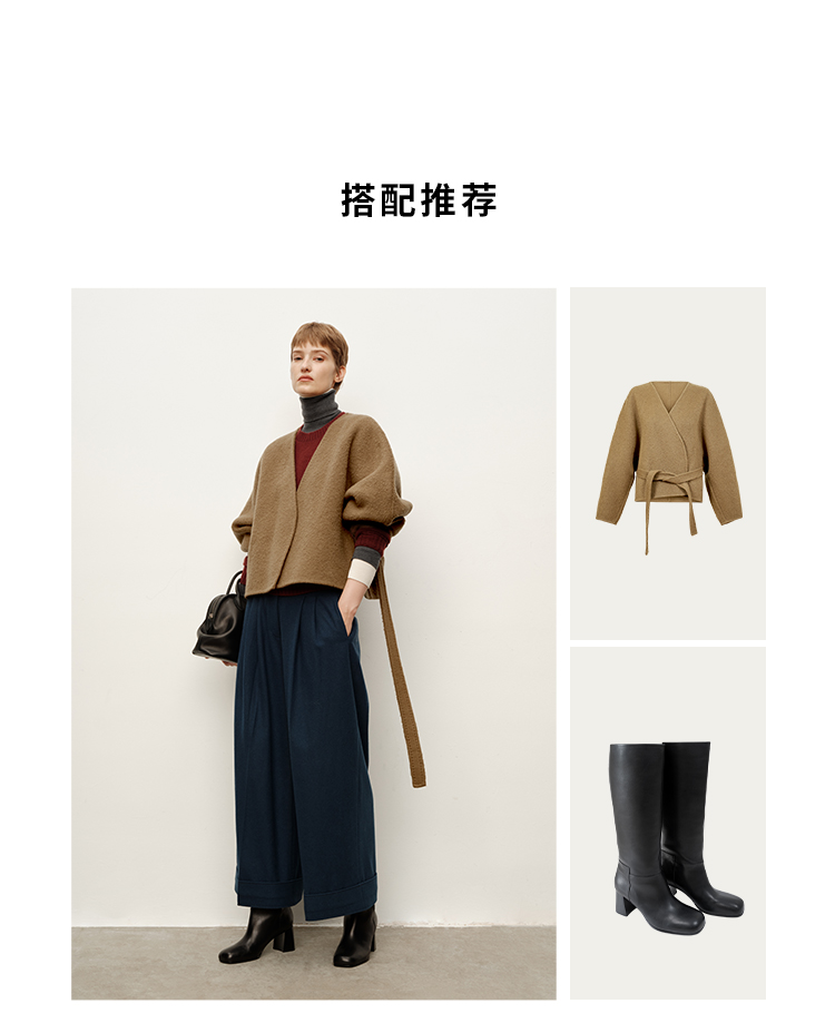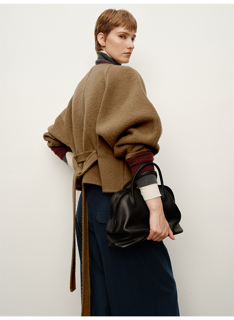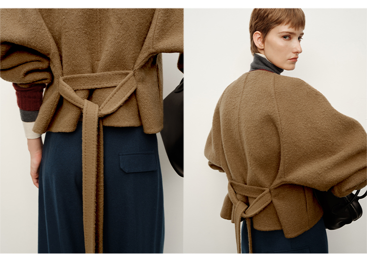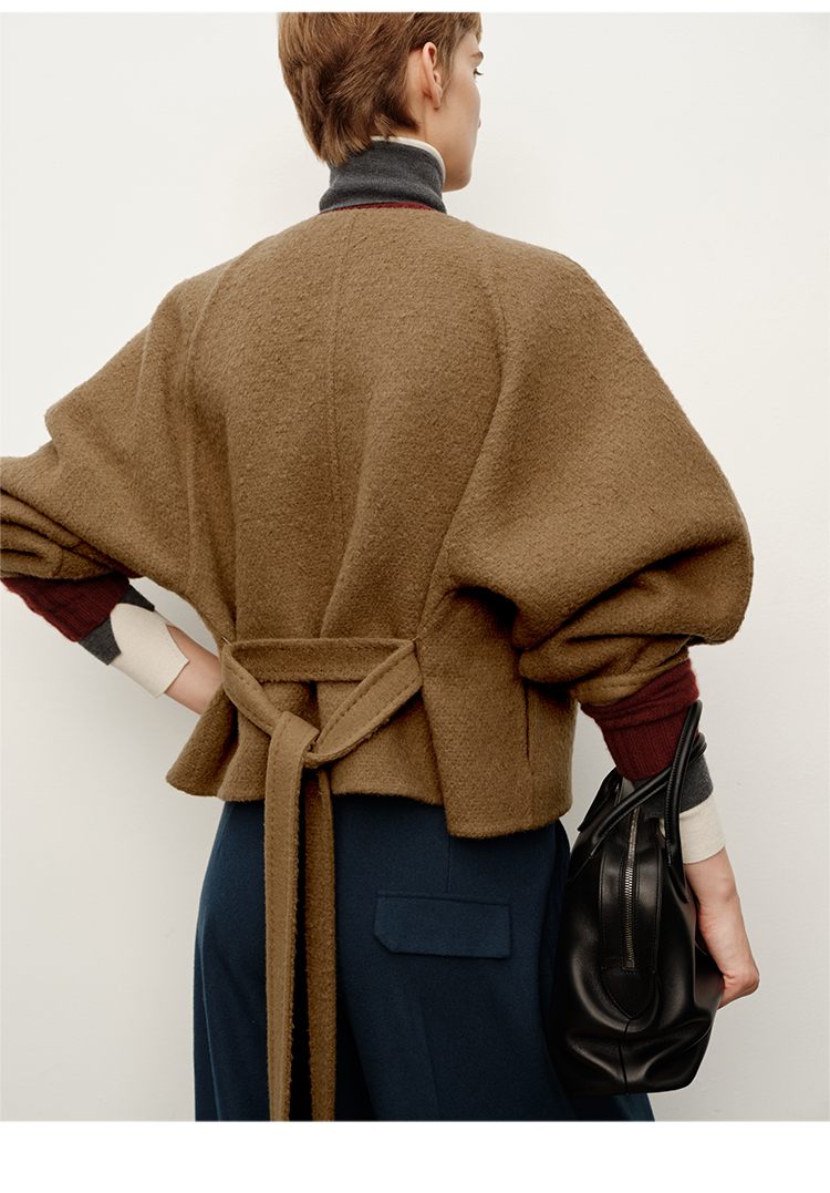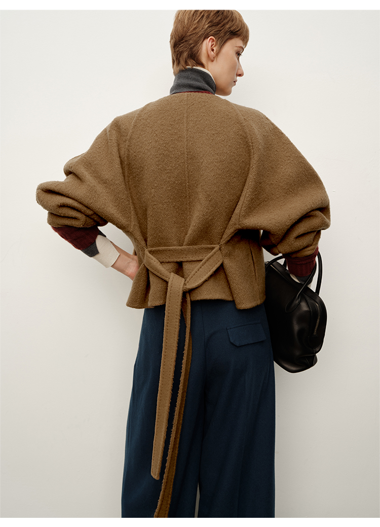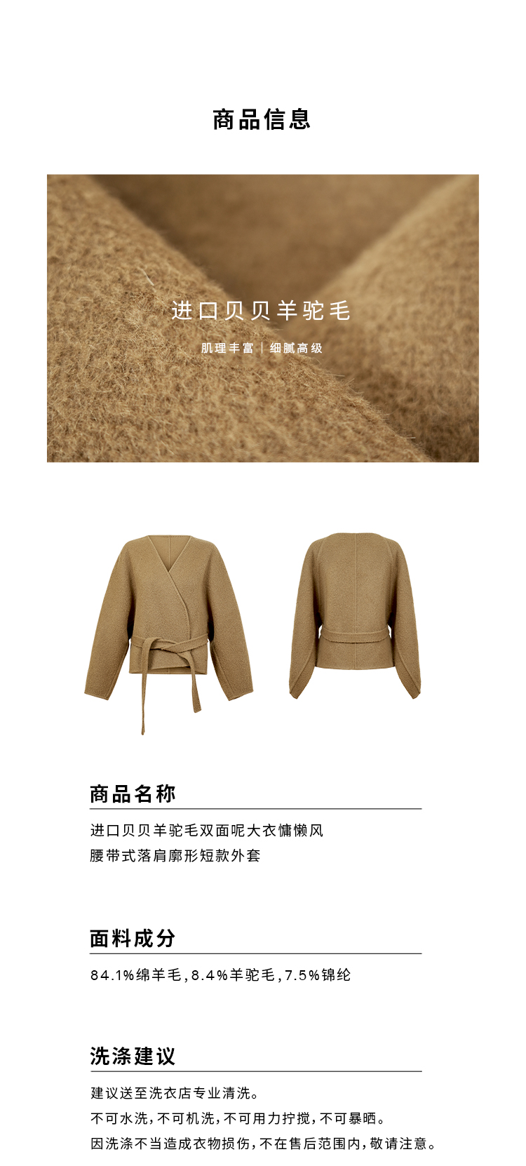 HIDEMI 进口贝贝羊驼毛双面呢大衣慵懒风腰带式落肩廓形短款外套