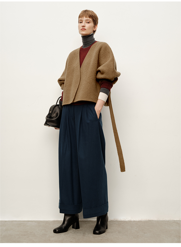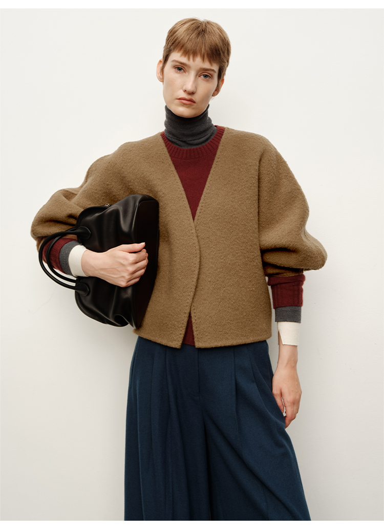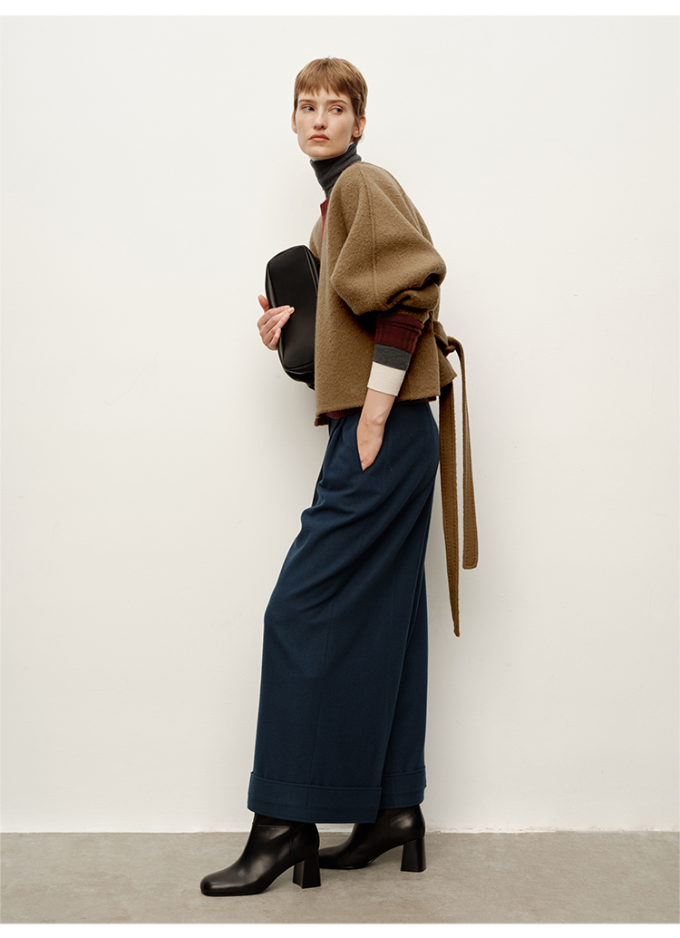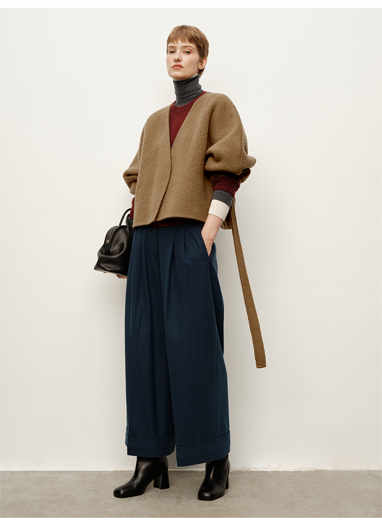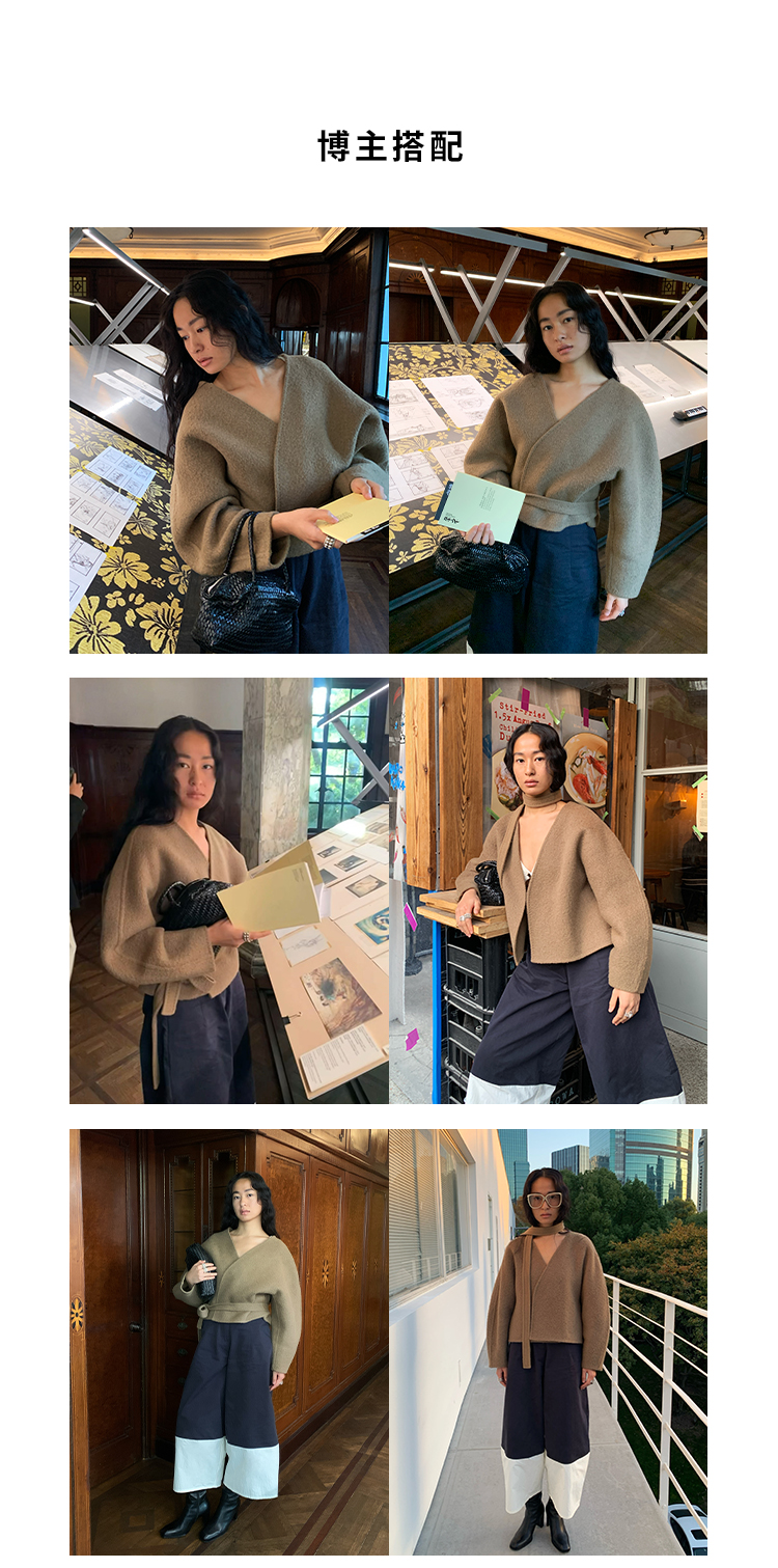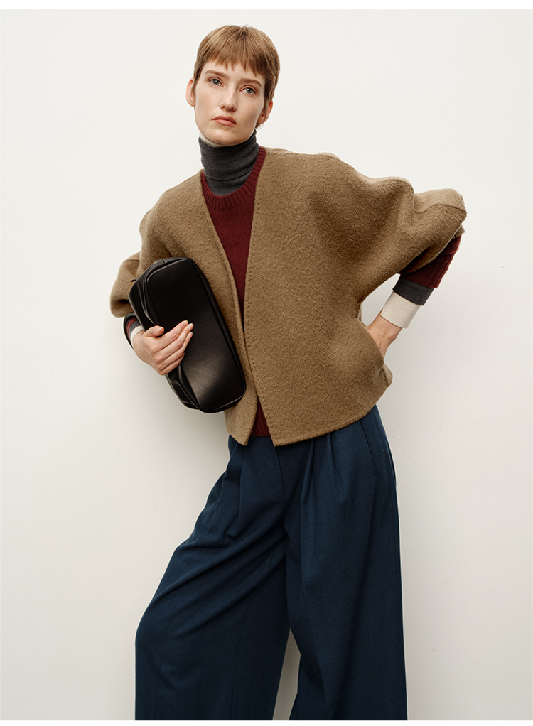 HIDEMI 进口贝贝羊驼毛双面呢大衣慵懒风腰带式落肩廓形短款外套