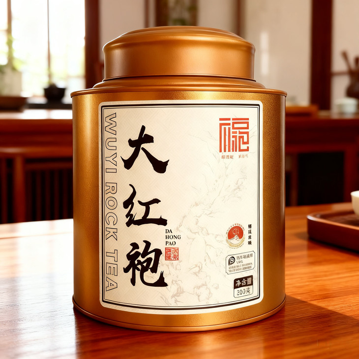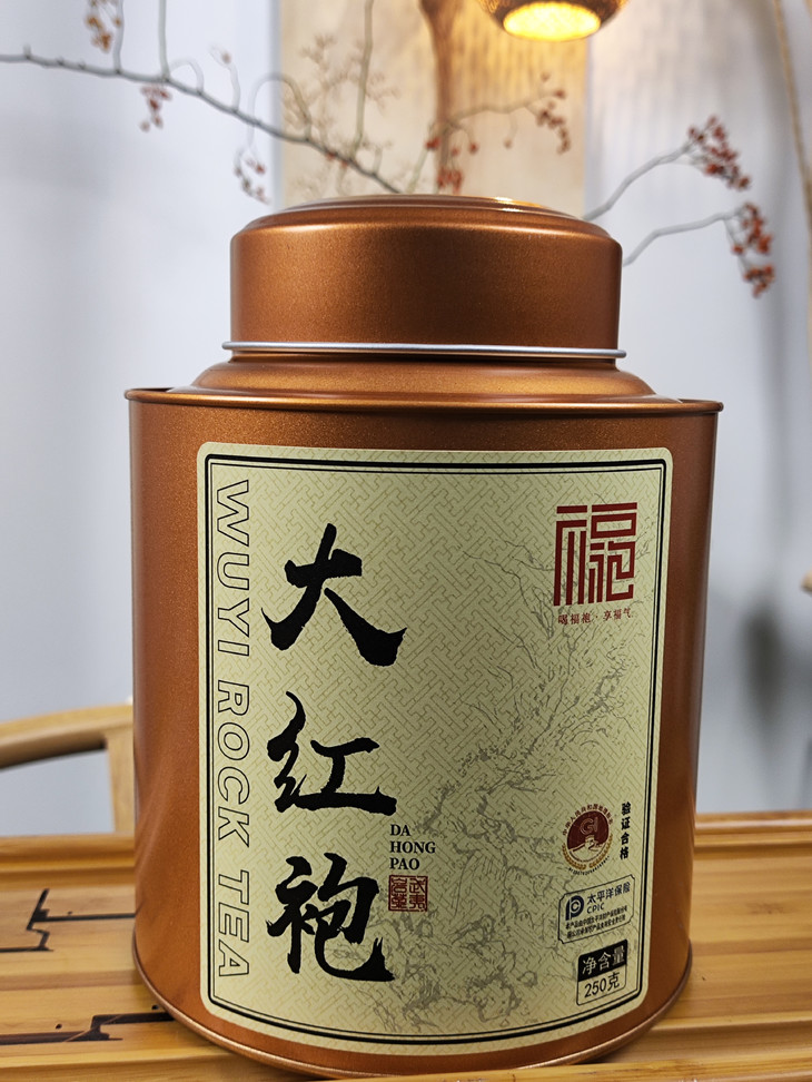 它采用金属质感的棕红色茶罐包装,外观沉稳大气,颇具质感,彰显品质感。 罐身的标签设计富有中式韵味,“大红袍” 三个大字苍劲有力,搭配传统纹样与山水图案,将武夷岩茶的文化底蕴融入其中,还印有 “喝福袍・享福气” 的吉祥语,传递美好寓意。 打开茶罐,内部茶叶采用透明塑封袋封装,并用金色扎带束口,保证了茶叶的密封性,250 克的净含量实用且有分量, 包装整体既体现了对收礼者的用心,又能让对方感受到大红袍的醇厚茶香与文化内涵,无论是送爱茶的长辈还是懂茶的朋友,都很显诚意。 快快入手叭~