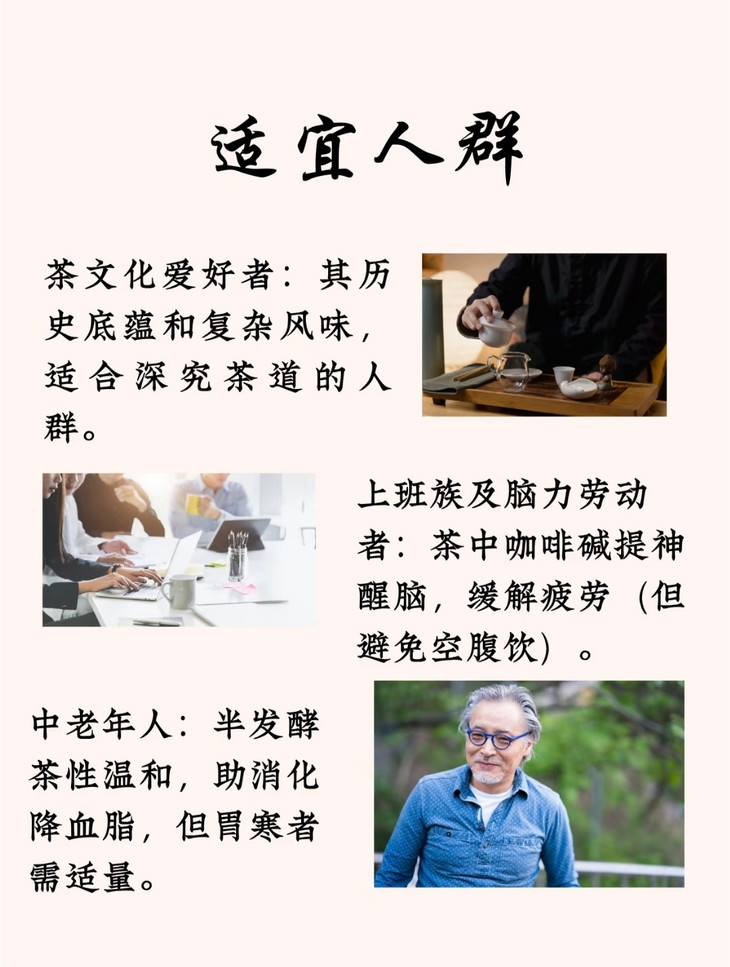 脑力劳动者:工作疲惫时,泡上一杯大红袍,茶中的咖啡碱能快速提神醒脑,缓解疲劳,让你在工作中保持高效状态。 注重养生的中老年人:大红袍属于半发酵茶,茶性温和,既能帮助消化,又有降血脂的功效,是日常养生的佳品。 追求驻颜养生的女性:茶中丰富的茶多酚是天然抗氧化剂,能帮助清除自由基、减少氧化损伤,长期适量饮用,既能滋养身心,又能为肌肤状态加分,搭配日常护肤,由内而外散发好气色~