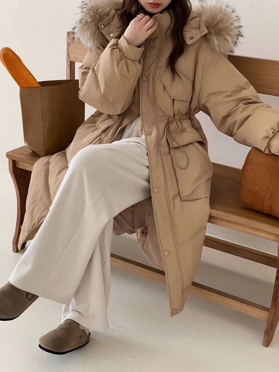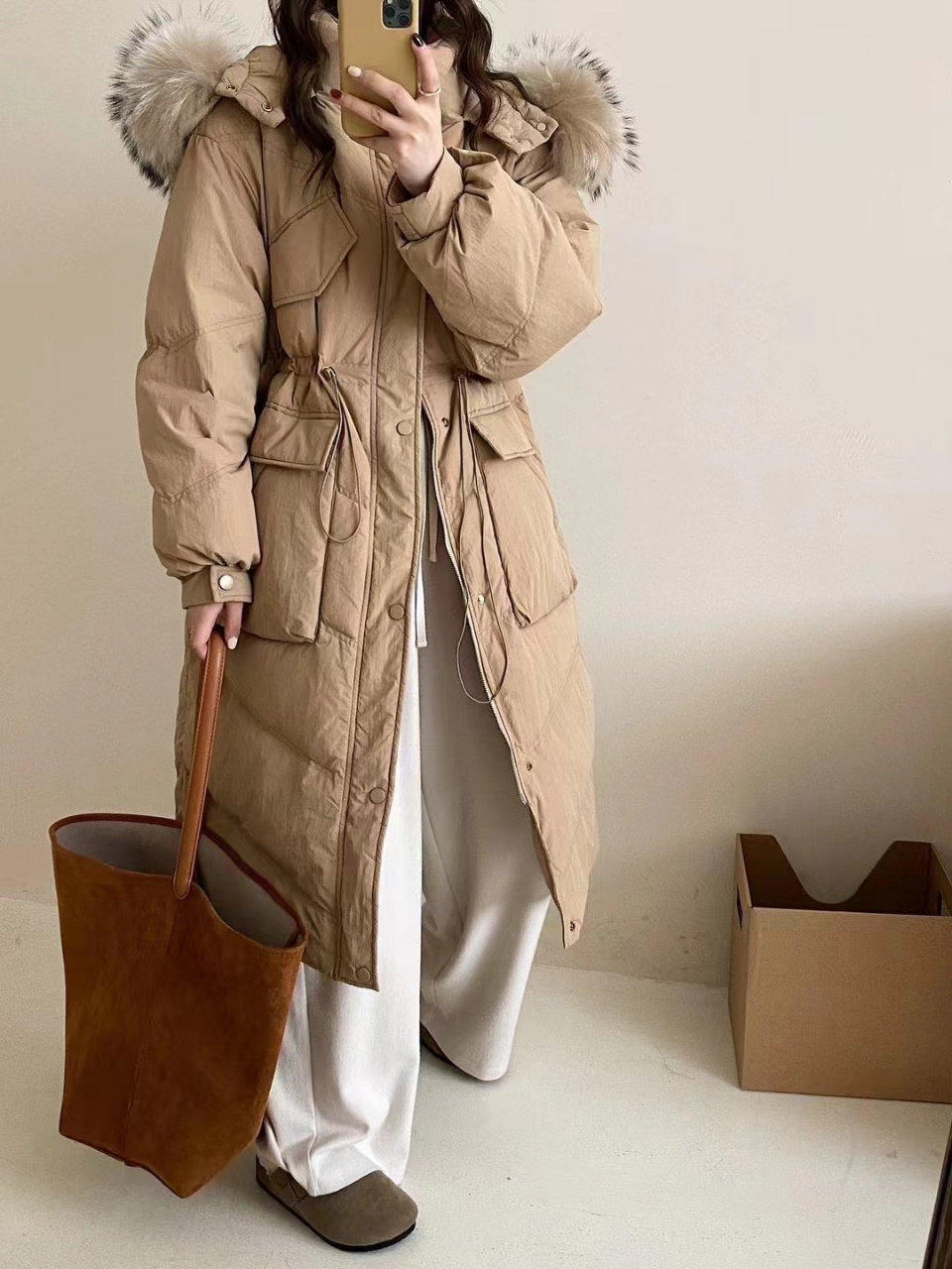 【YW】无忧购大毛领冬季50绒羽绒服女加长款过膝加厚收腰外套6611