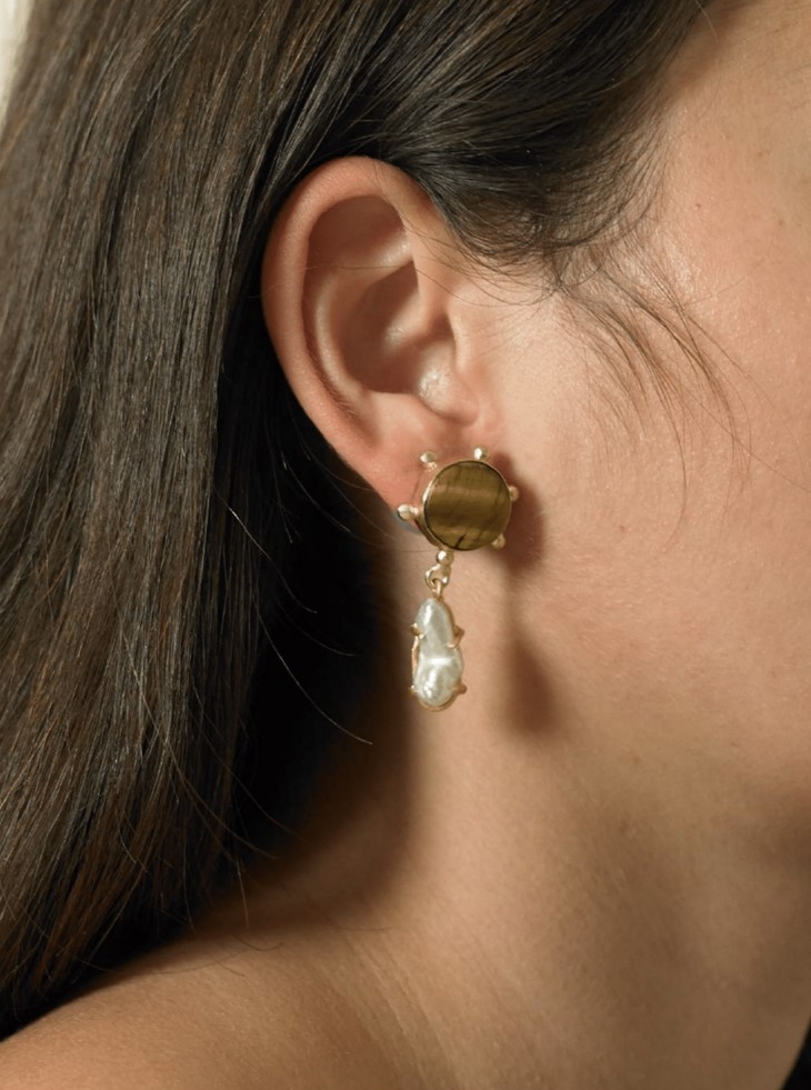 材质:Handmade Amphi earrings in 14K gold plated brass metal, Tiger stone and Baroque pearl. A lightweight piece inspired by the silky lustre of metamorphic rocks.