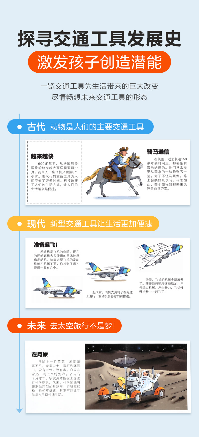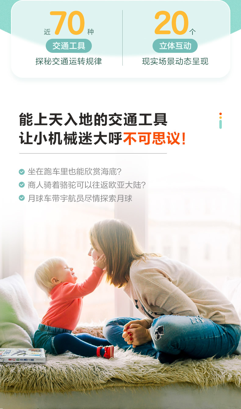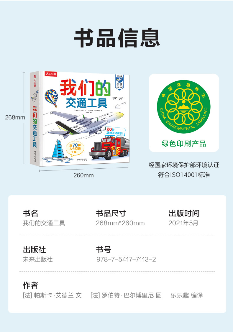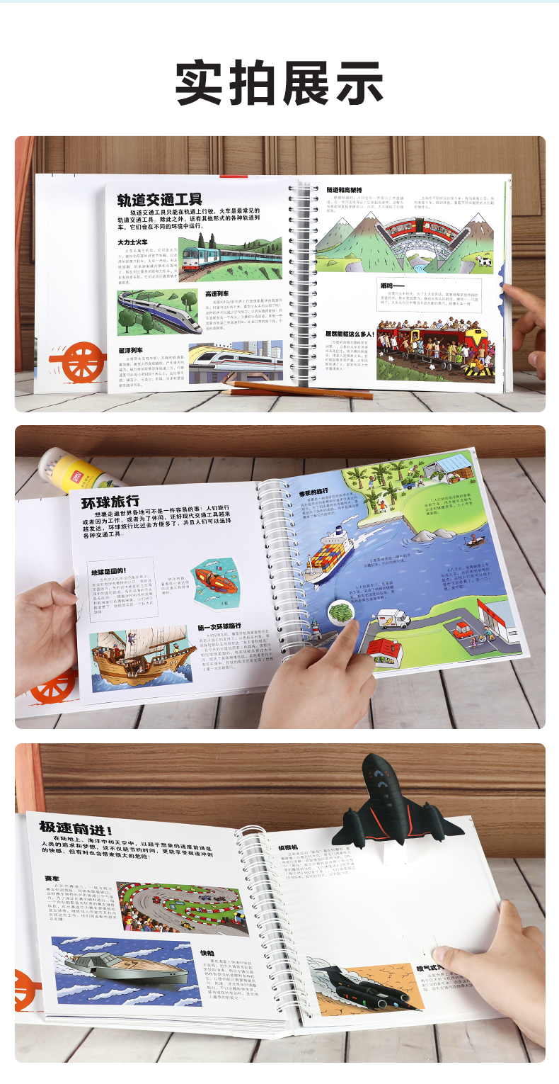 孩子们对于交通工具的喜爱,是毋庸置疑的。本书内容丰富,几乎涵盖了海陆空近70种交通工具种类。通过活页、转轴、拉杆和转轮等设计,生动地展示了各种场景和主题。在增加图书趣味性和互动性的同时,还可以提升孩子的动手能力。让孩子在趣味中了解各种交通工具,秒变交通百科小达人。