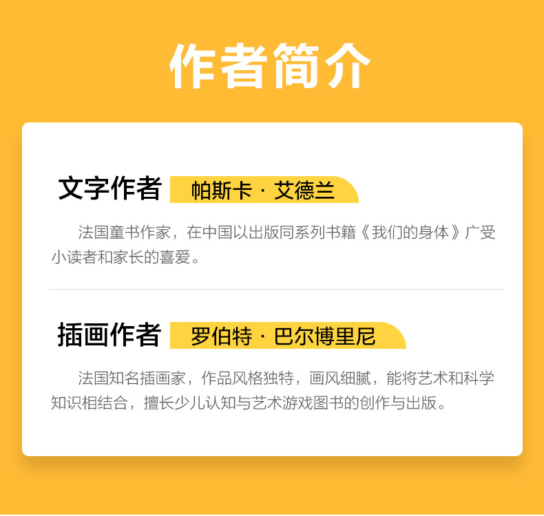 帕斯卡·艾德兰 法国童书作家,主要创作学前儿童用书,尤其擅长美术类、益智游戏类图书。画风鲜艳,内容生动,形式新颖,广受欢迎。在中国以出版同系列书籍《我们的身体》广受小读者和家长的喜爱。