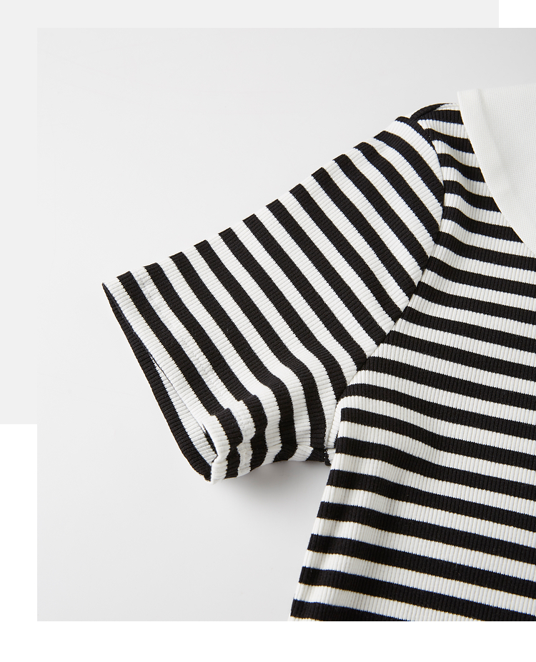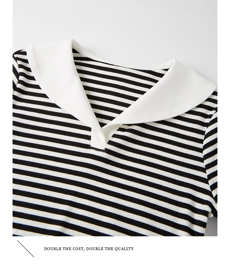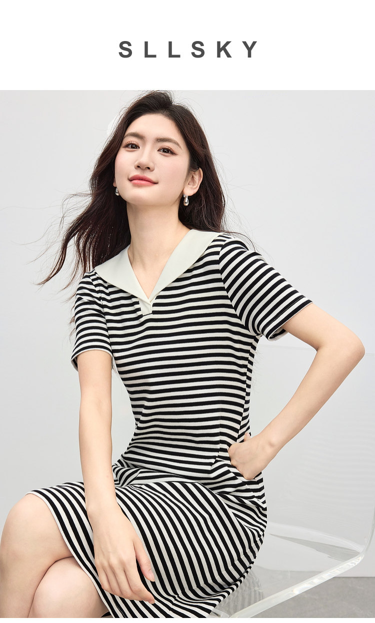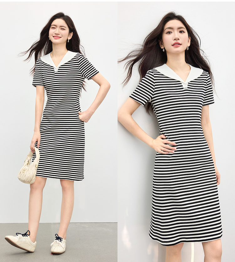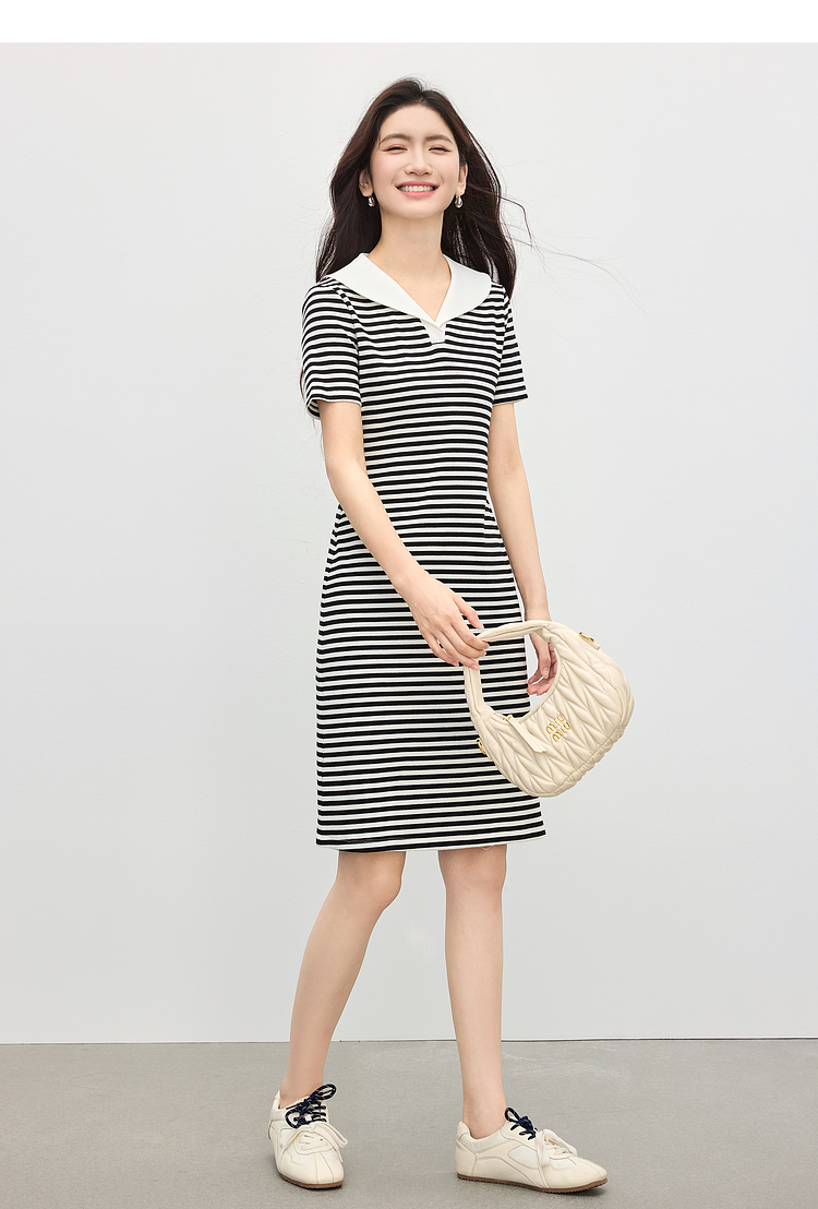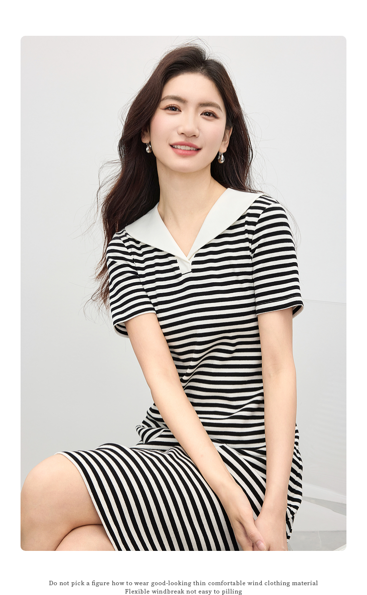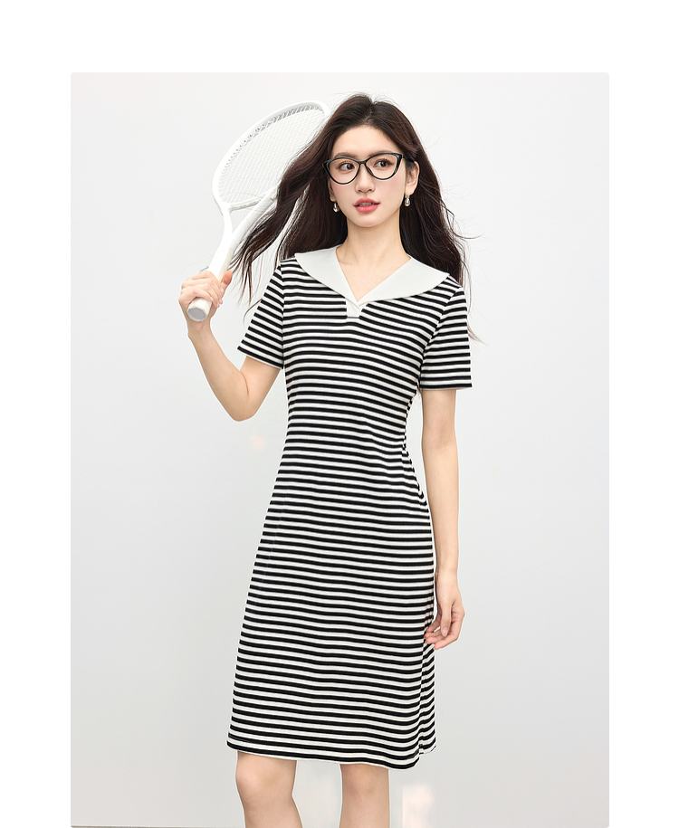 【专属特价】熙世界2025夏季新款撞色海军领条纹连衣裙女收腰显瘦减龄休闲裙子