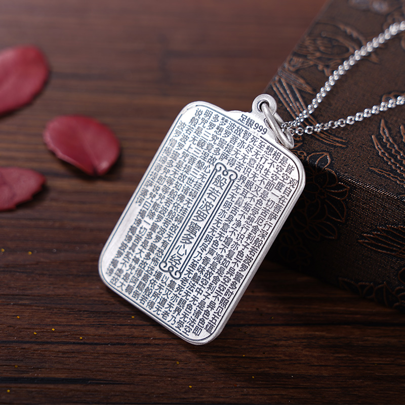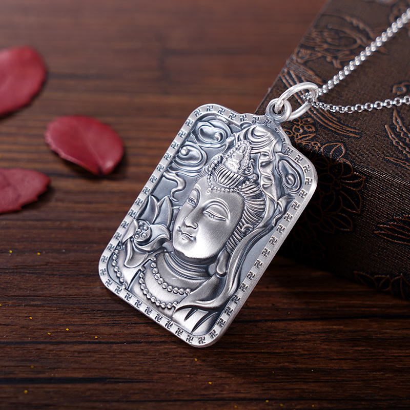 【寓意】:作品正面雕刻观自在菩萨,背面刻有心经。寓意通过菩萨的感应增慧修福,驱邪避凶,护身护心。