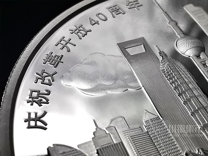 背面图案之三:为上海浦东标志性建筑及南浦大桥、黄浦江等组合设计,并刊“庆祝改革开放40周年”字样及面额。