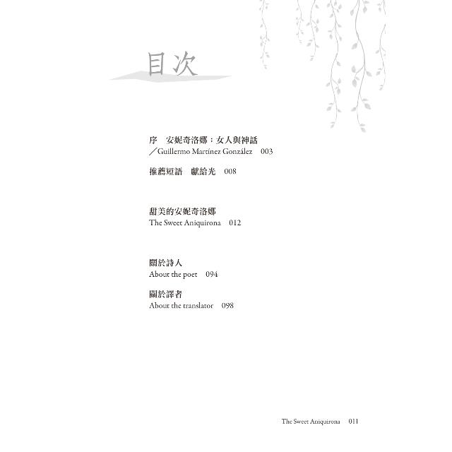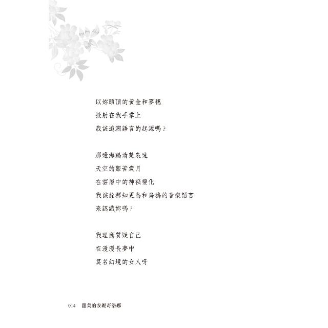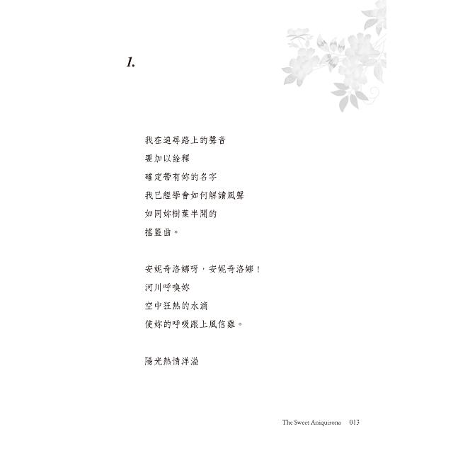 ☆《甜美的安妮奇洛娜》是一首由26個小節集成,情感濃烈的情詩。作者溫斯敦.莫拉雷斯.查華洛將「安妮奇洛娜」的女性形象與自然環境結合,帶來了富含神秘的美感。