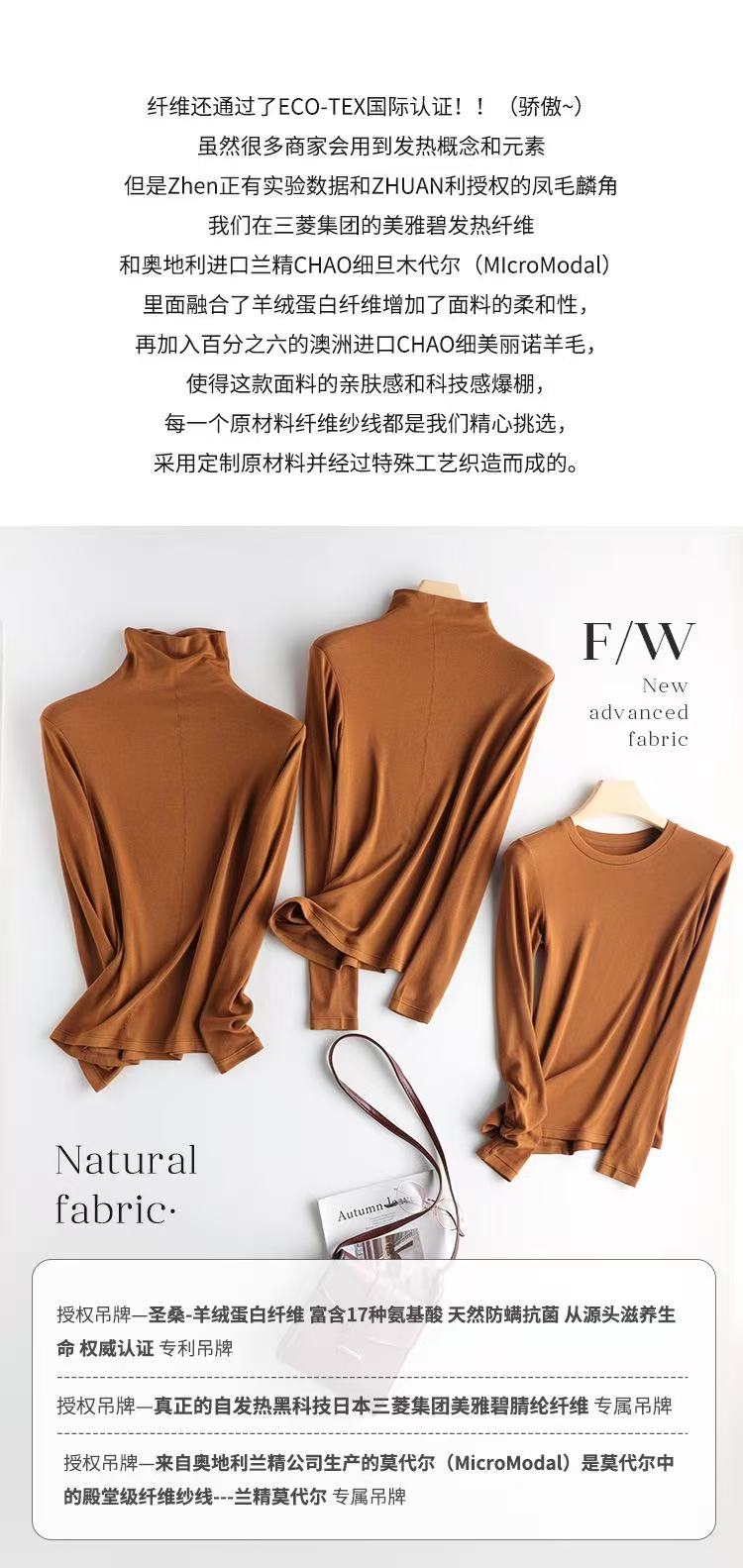 凝萃羊绒蛋白精华的动物纤维毛根细长、光泽好、细密轻暖 ;素有“纤维皇后”之称,再结合我们澳洲进口超细羊毛纱线、和美雅碧发热纤维、兰精莫代尔再生纤维组成了我们这款富含17种氨基酸、防螨抗菌、抗静电、抗起球、吸湿发热、吸湿排汗、免烫、除臭等等很多功能于一身的黑科技打底衫~