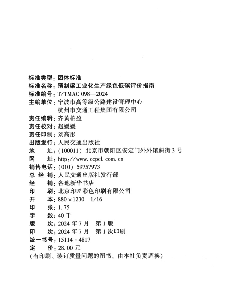 书名:预制梁工业化生产绿色低碳评价指南(T/TMAC 098—2024)