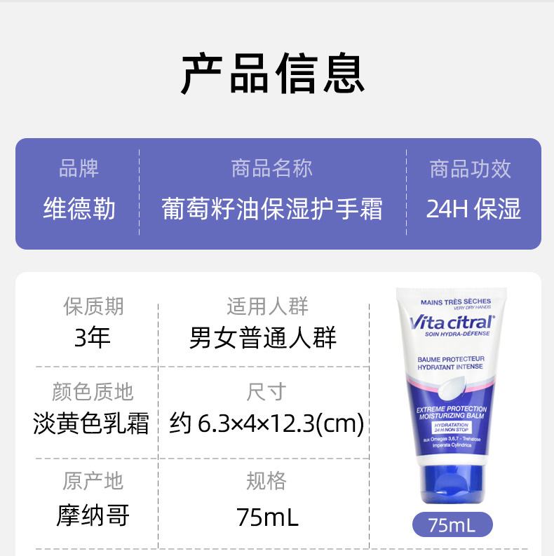 Vita citral 维德勒 葡萄籽油保湿护手霜 摩纳哥进口 多规格可选 60年欧洲经典护手品牌