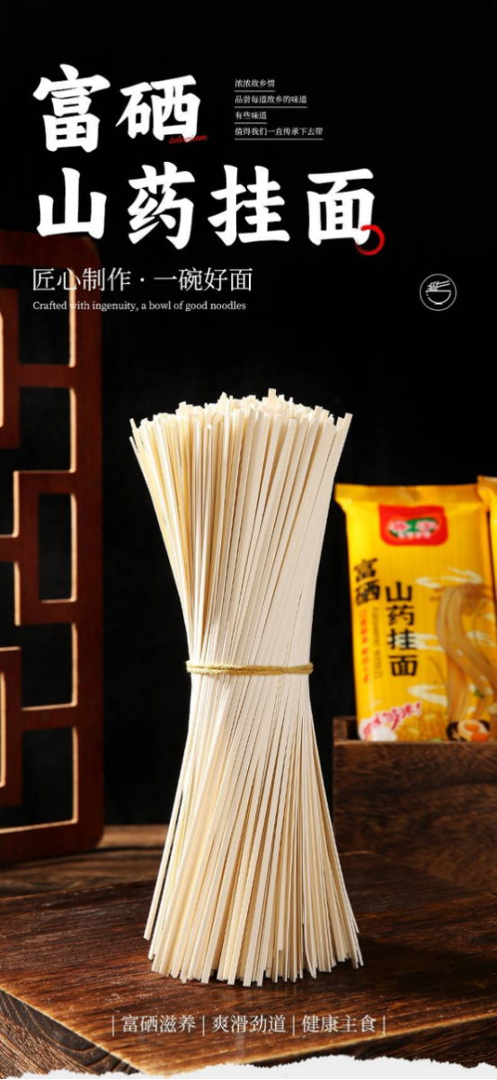 口感丰富、包容百味、吃法多样的富硒山药面 做成汤面则汤清面香,爽滑细腻,一口下去温暖脾胃 做成凉面搭配各色配菜,挂满浓郁汤汁 滋味十足,让人吃了还想吃!是您餐桌上不可多得的健康美味!