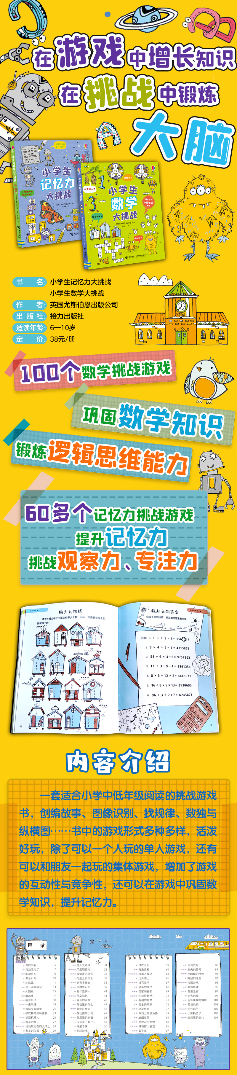 《小学生记忆力大挑战》与《小学生数学大挑战》是一套适合小学中低年级阅读的挑战游戏书,为了避免能力训练变得枯燥,书中的游戏形式多种多样,活泼好玩,除了可以一个人玩的单人游戏,还有可以多个人一起玩的集体游戏,增加了游戏的互动性与竞争性,激发孩子的游戏热情。