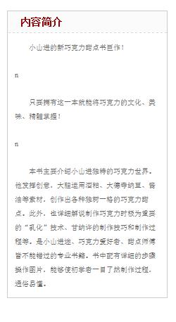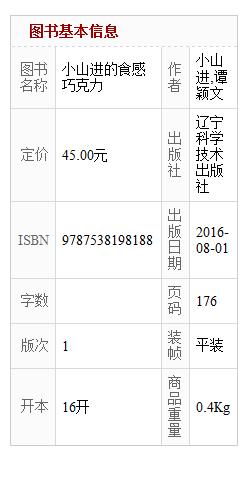 | 适读人群 :烘焙爱好者 来自日本的世界*一的巧克力! n外国*佳巧克力师傅奖得主! n巧克力制作基础大全! n小山进是21世纪*具代表性、也*有才华的巧克力师傅之一, n虽然他是日本人,但他的巧克力堪称, n带给法国人的震撼,不输当年美籍摄影师曼雷(MaRay)的作品《Le Violod′Ingres》。 n谢谢你,小山先生!我们与前来参加巧克力沙龙展盛会的所有人, n都由衷地感激能品尝到你创作出来的*佳美味。 nSylvie Douce n巧克力沙龙展创办人暨负责人 n小山进的巧克力是在法国, n尤其是巴黎*名副其实享有盛誉的作品, n他不但不模仿他人,还会加入独特的创意, n对于他在日本努力提供美味巧克力的坚持,值得赞扬。 n然而,要是有一天他到我们国家开设巧克力店, n相信也不会有人有异议,因为就算是在法国他也能成功。 nJacques PESSIS n巧克力爱好者俱乐部会长 n |