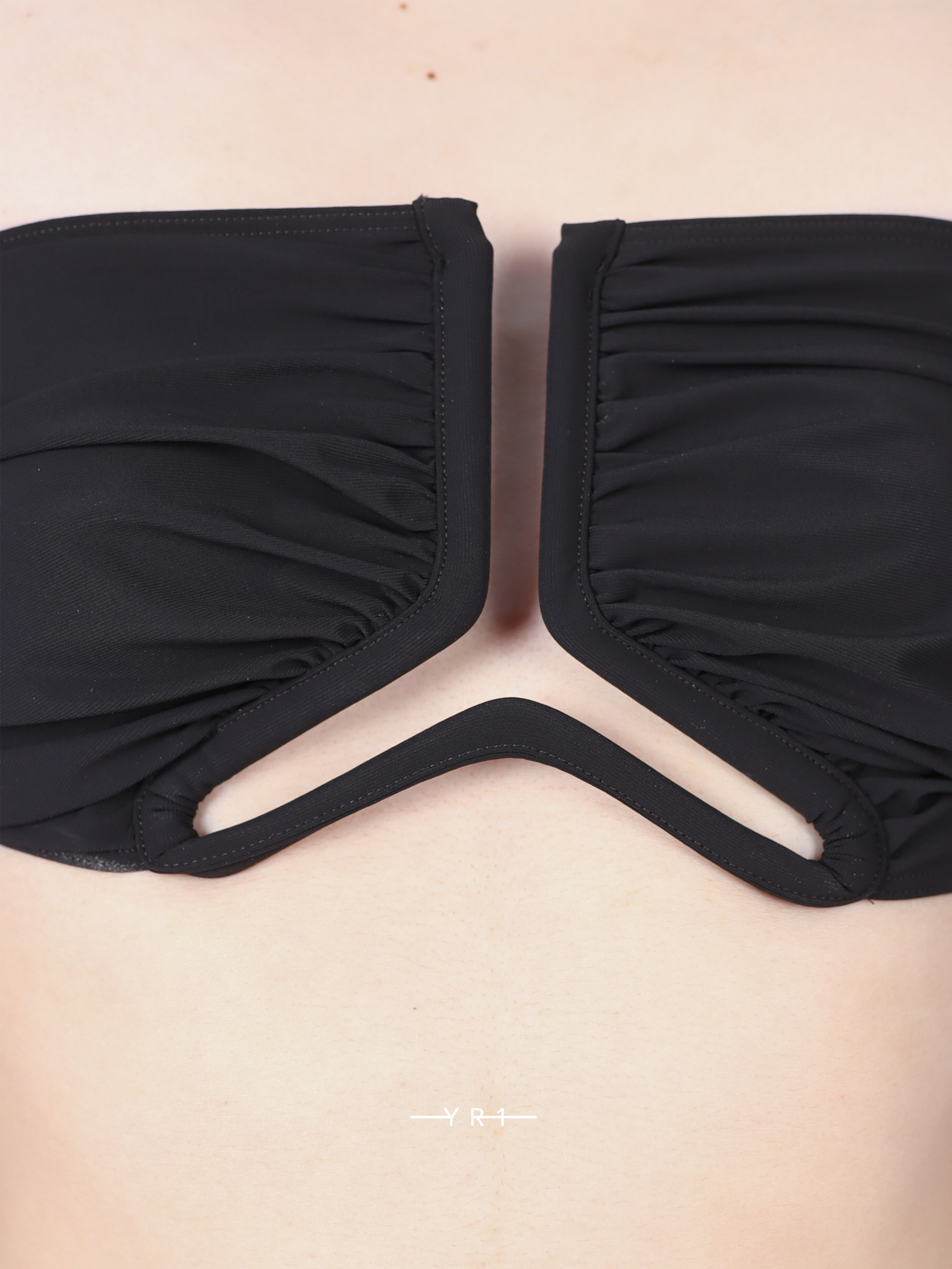 以其独特的几何造型和抹胸式设计令人着迷。宽大的中央拼接和醒目的下摆,巧妙地形成一个略带不对称的V字形开口,优雅地勾勒出曼妙身姿。深邃的黑色与略带光泽的弹力面料相得益彰,带来完美贴合的穿着体验和舒适的穿着感受。