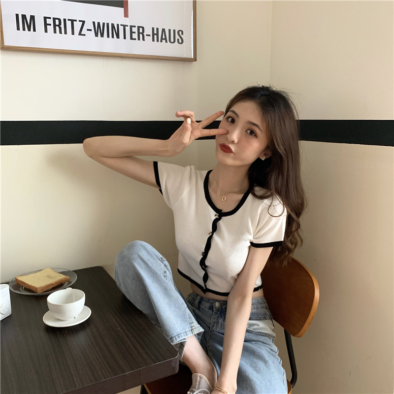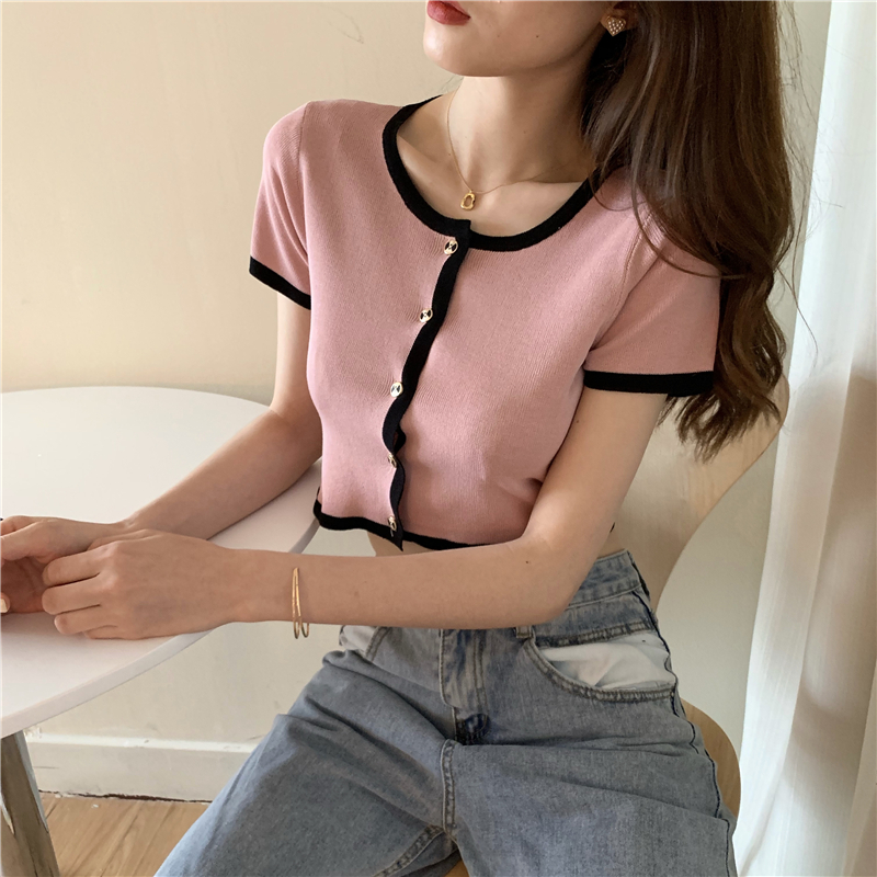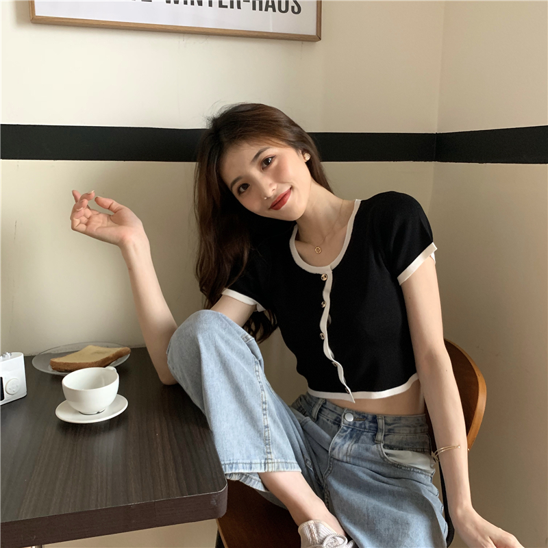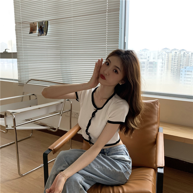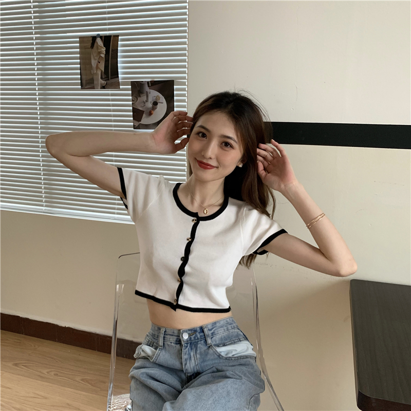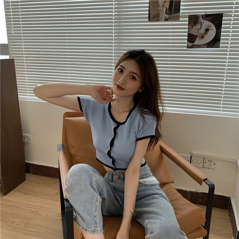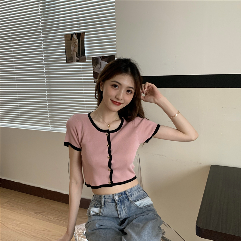 2021夏季新款ins露脐短款冰丝针织修身开衫简约短袖上衣女潮服饰女装出游清凉上衣七夕情人节