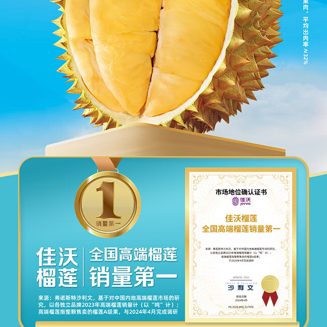 佳沃金枕榴莲A果 约2.0-2.5kg/个(随机发货,成熟度不同,切勿生开,生开不退不换)