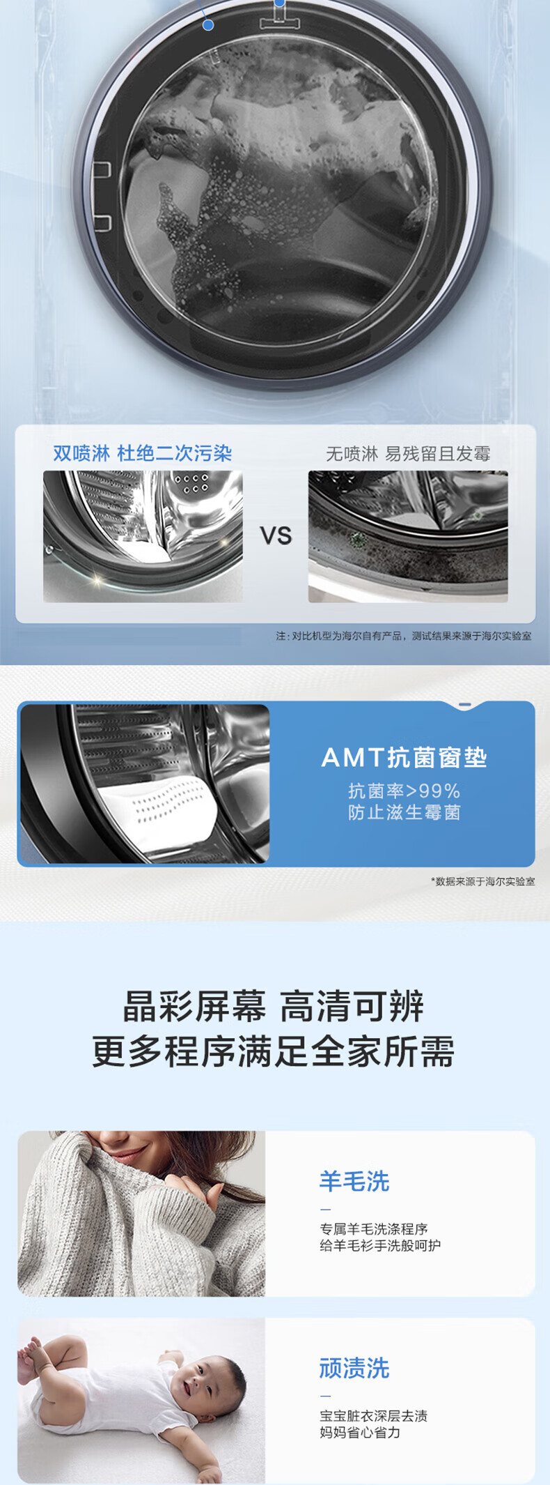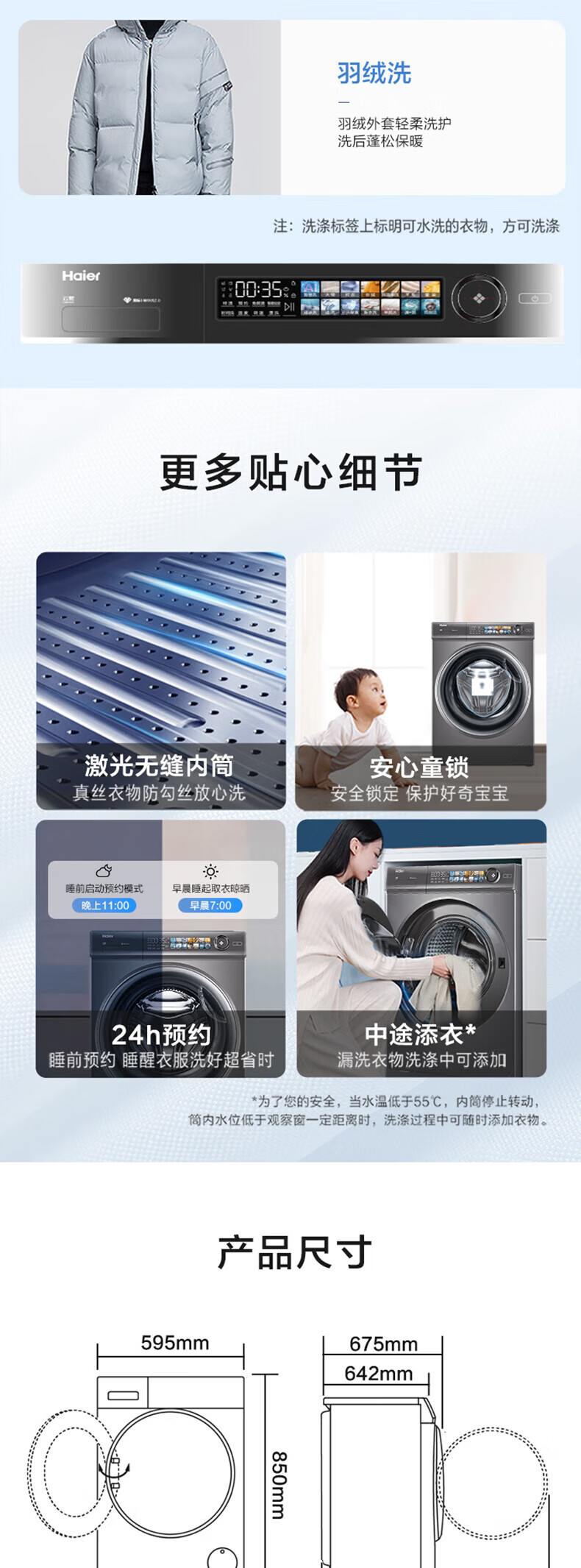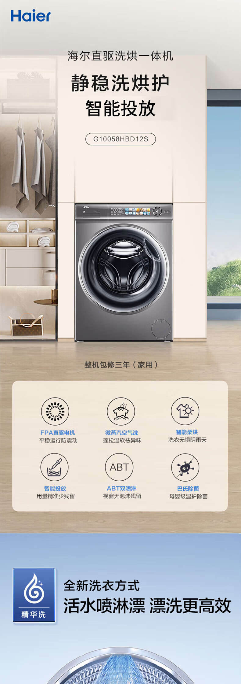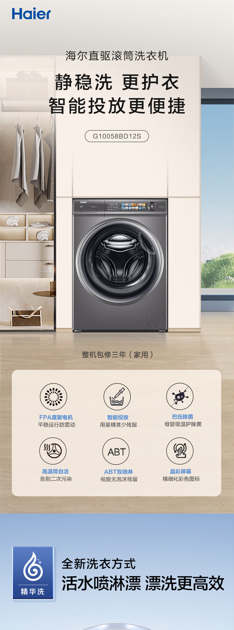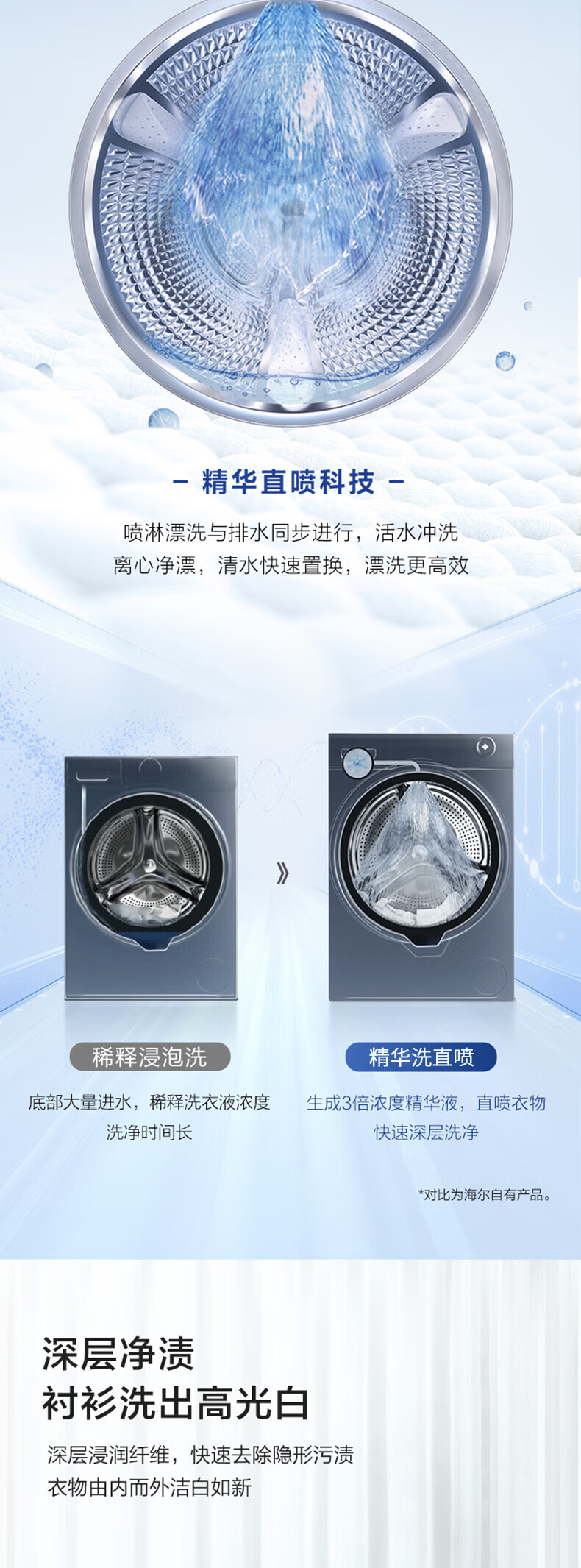 【2023新品】海尔精华洗直驱变频滚桶洗衣机058全自动10KG一级能效智能投放除菌除螨家用洗衣机