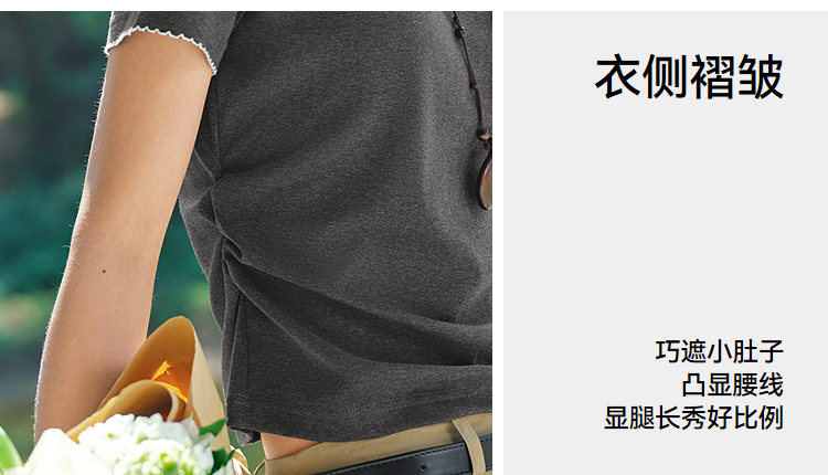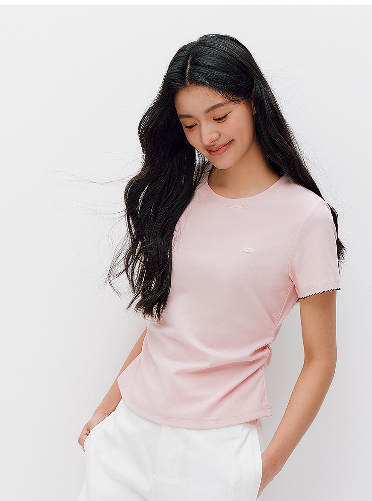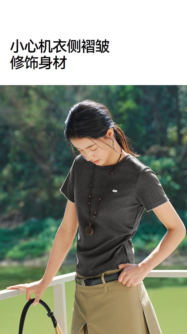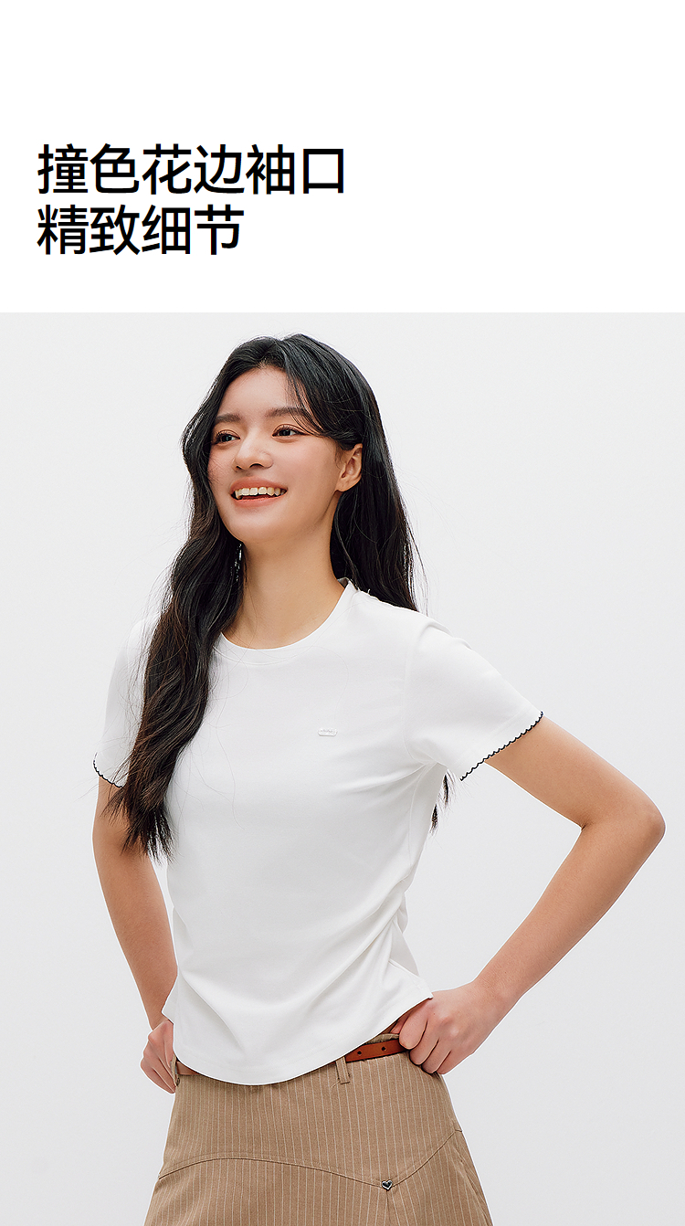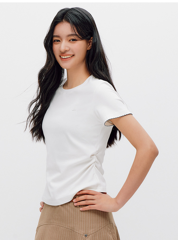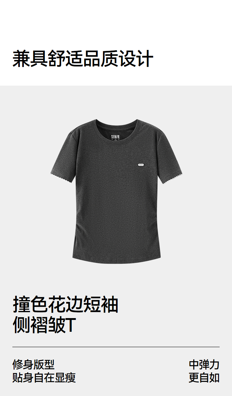 商场同款|森马短袖T恤女夏季修身褶皱撞色花边套头衫2026新款上衣