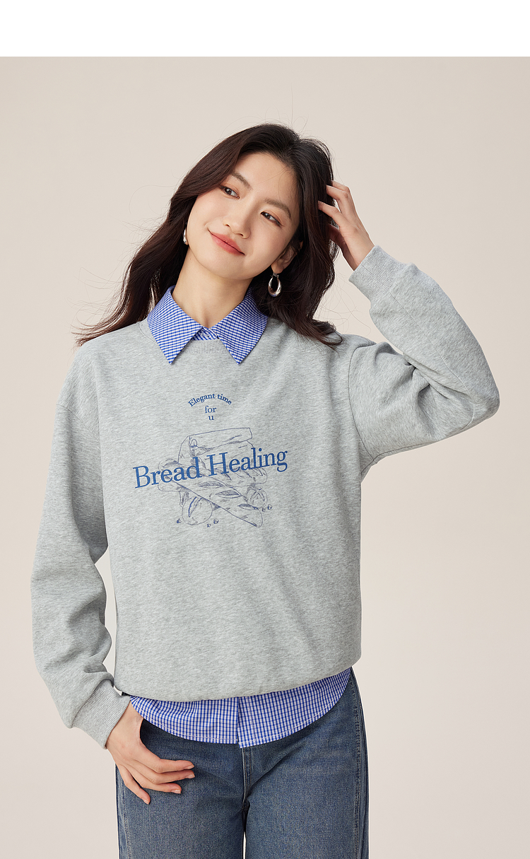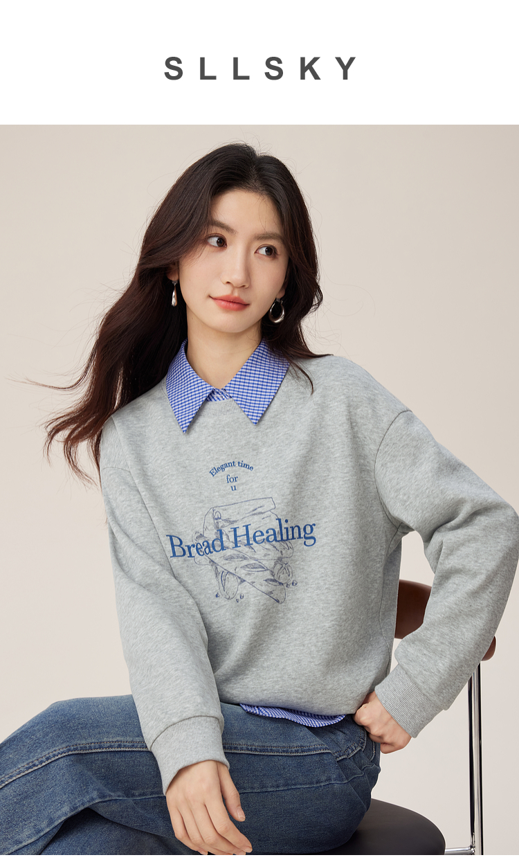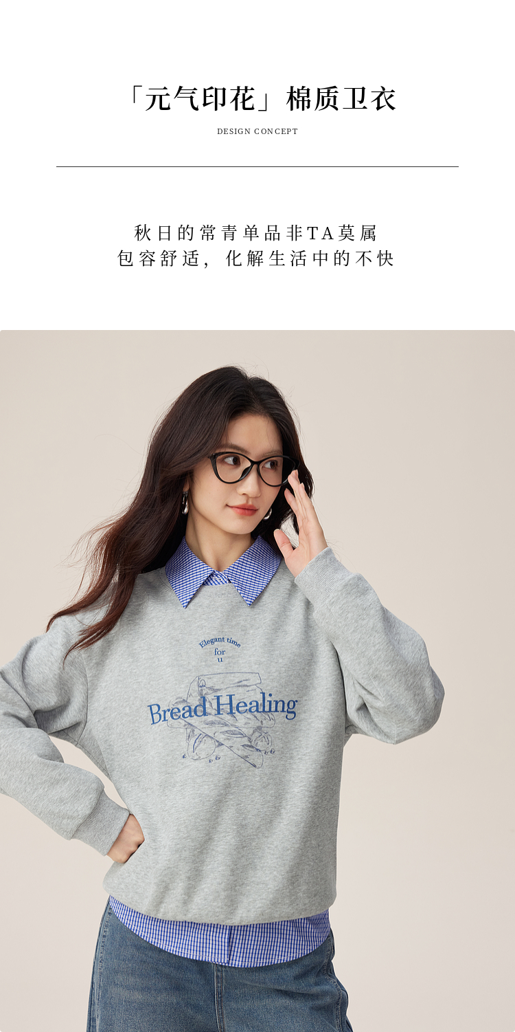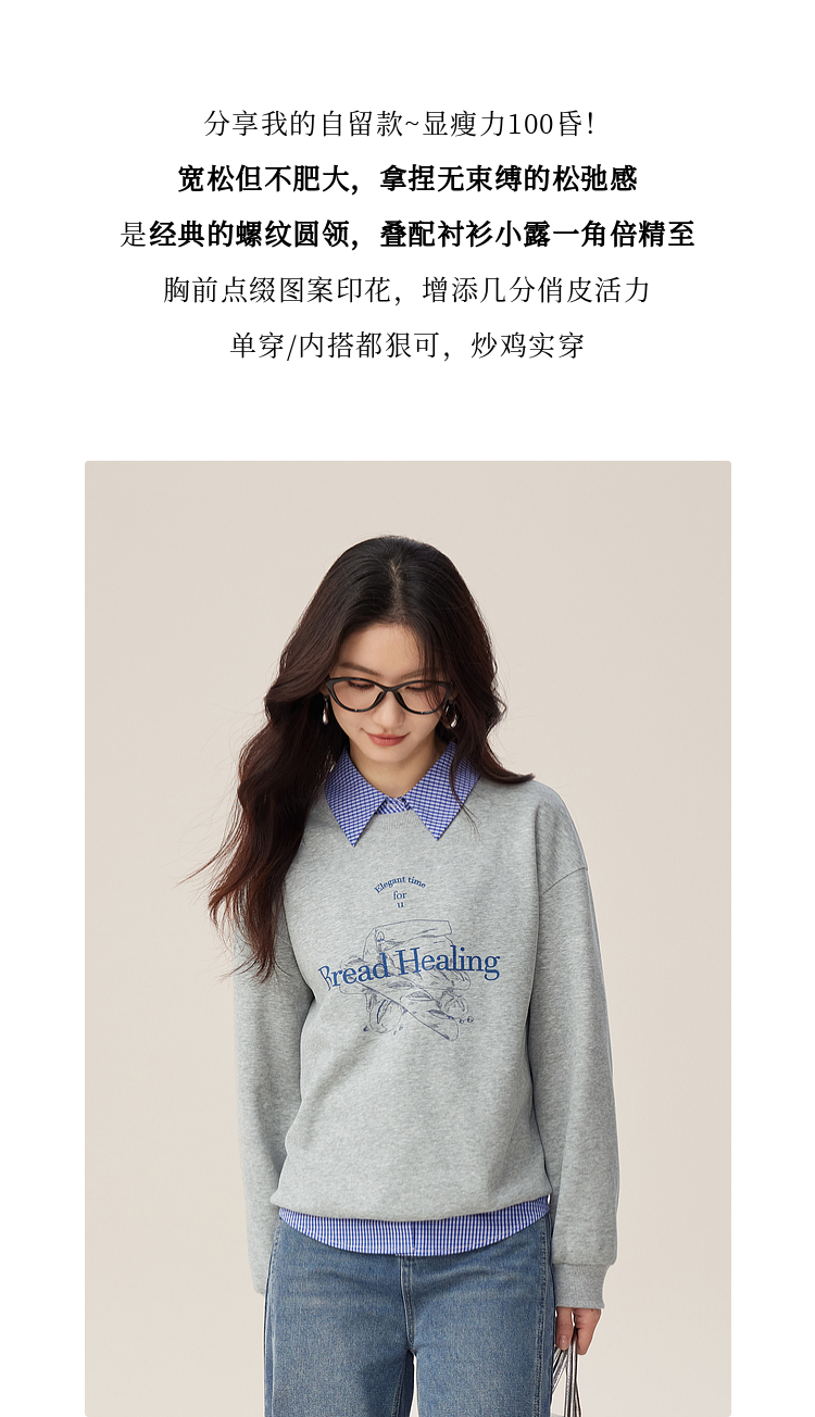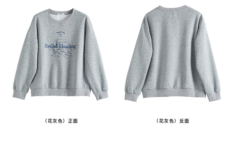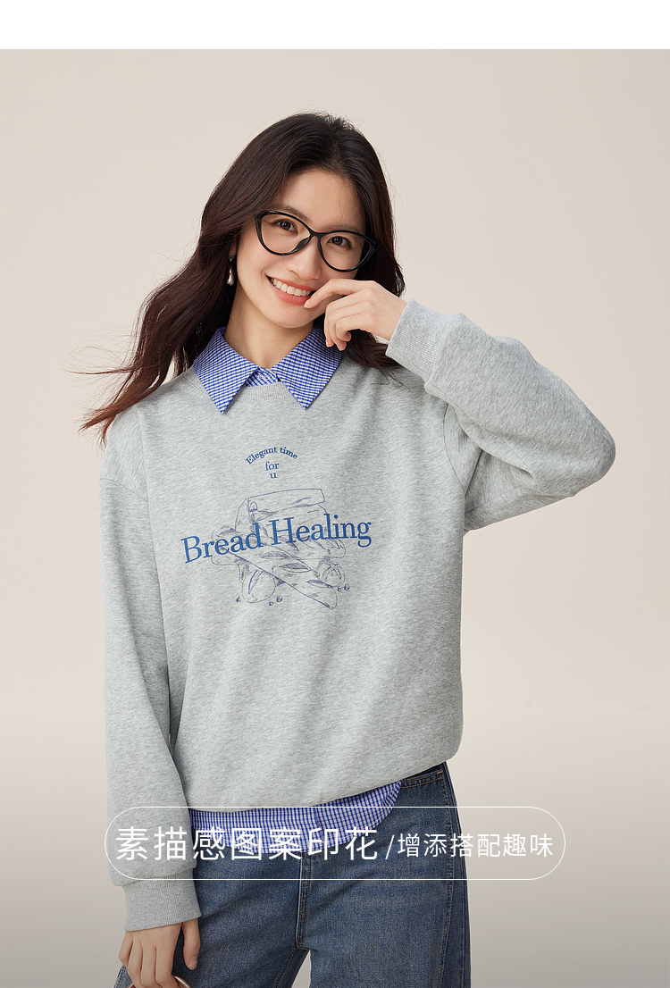 【周末秒杀】熙世界学院风灰色印花圆领卫衣女士长袖2025秋季新款复古宽松上衣