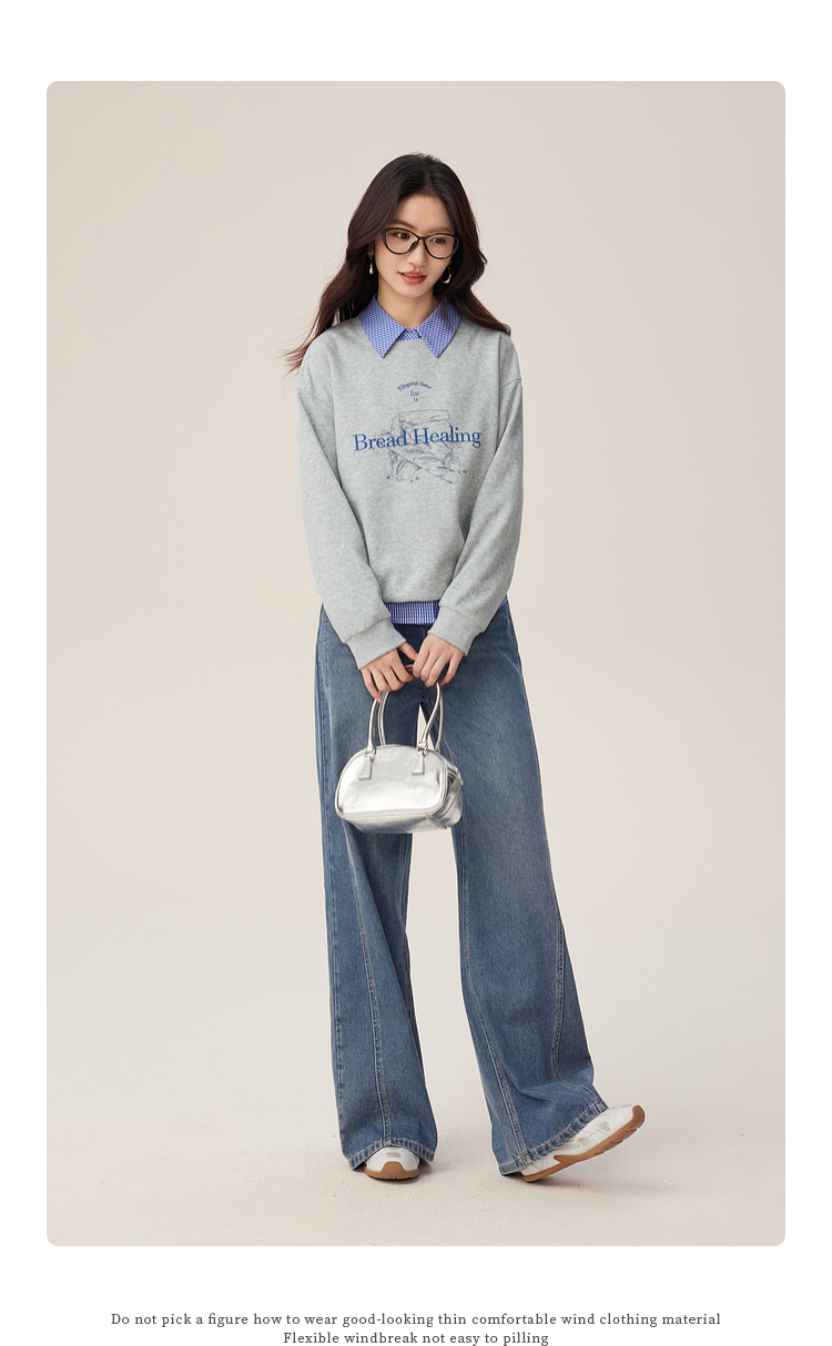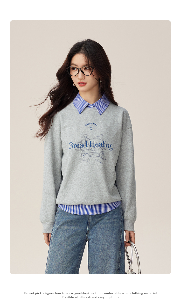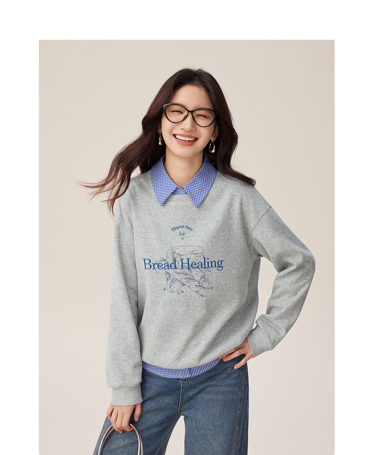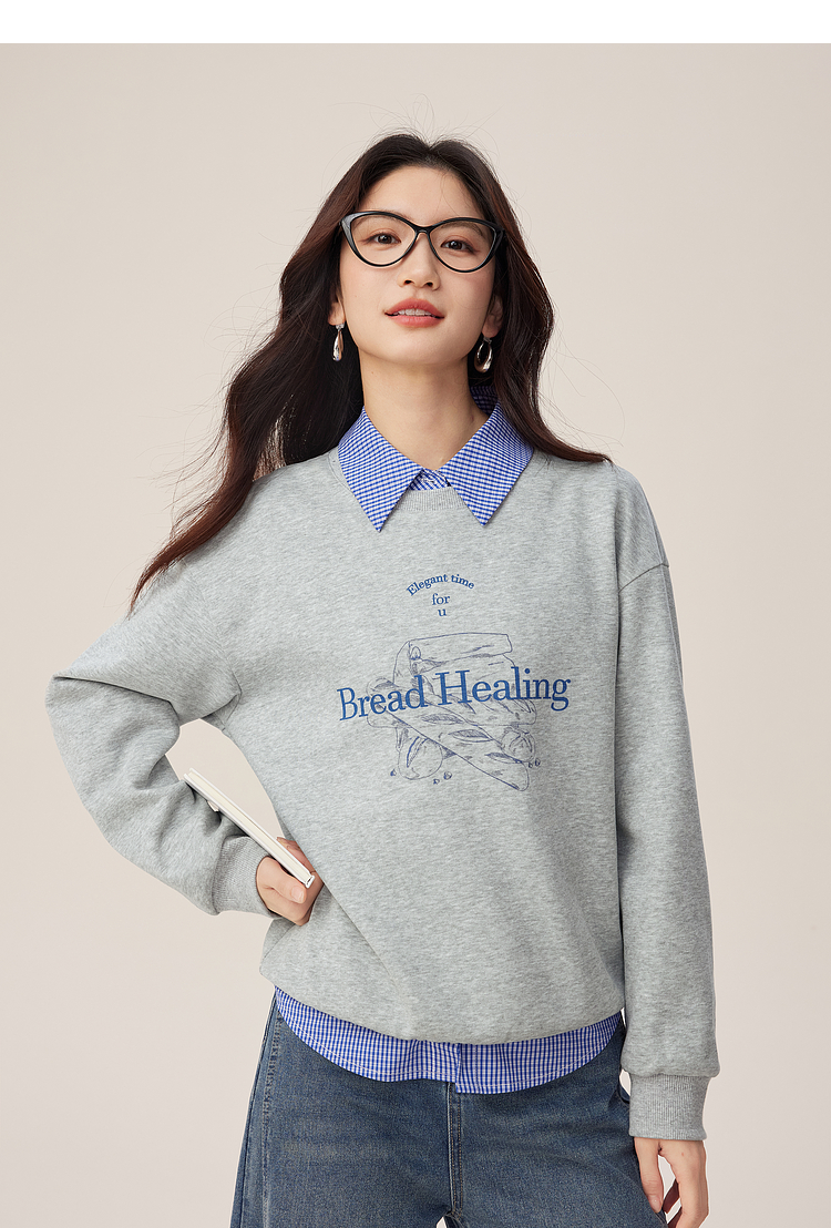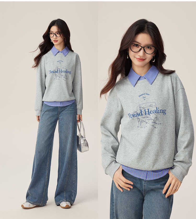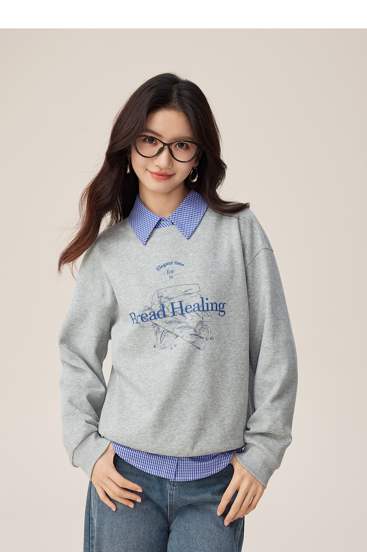 【周末秒杀】熙世界学院风灰色印花圆领卫衣女士长袖2025秋季新款复古宽松上衣