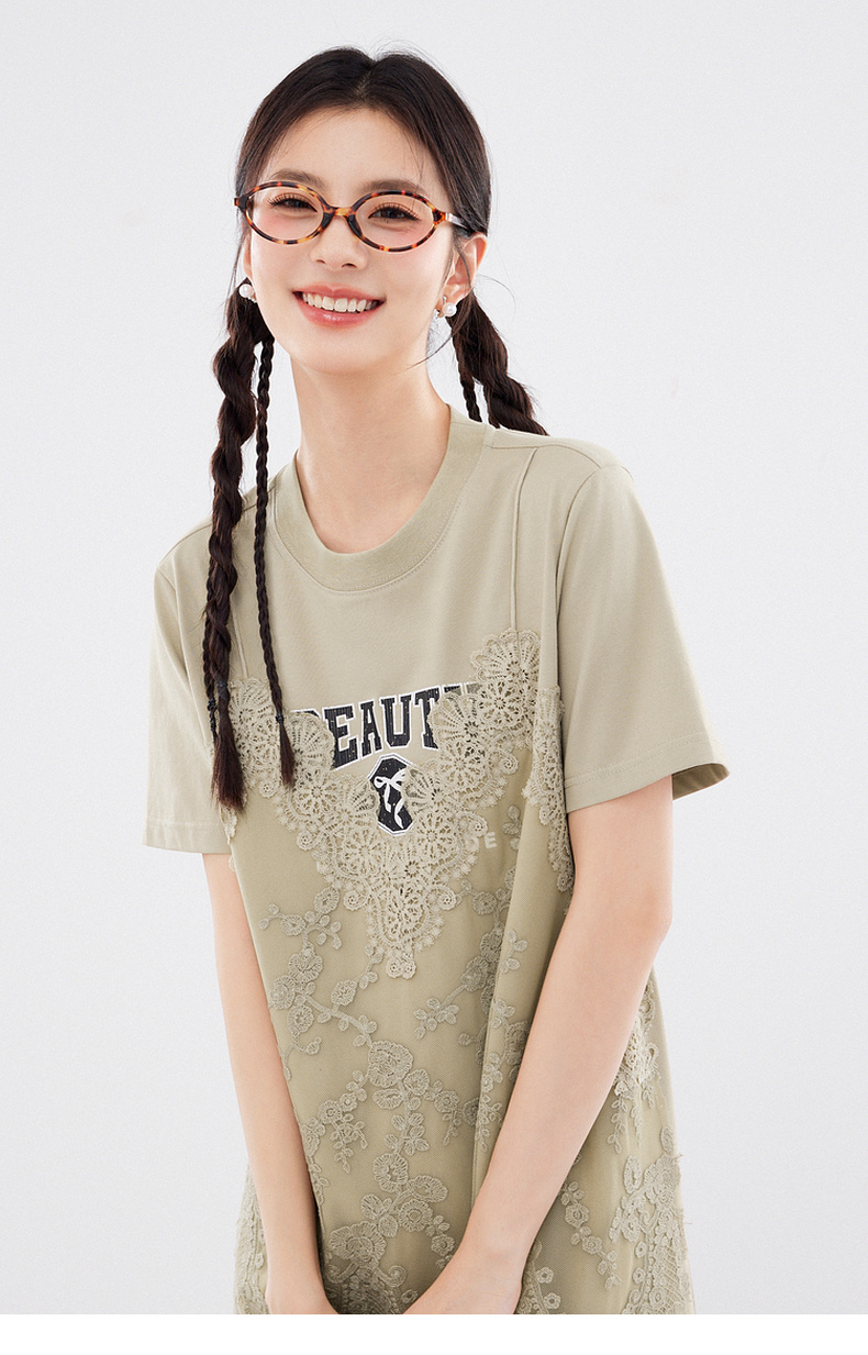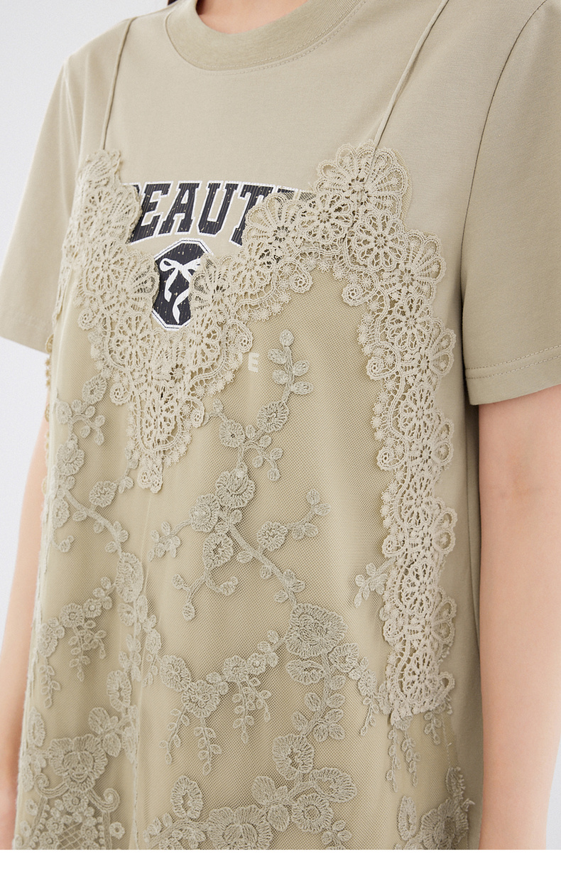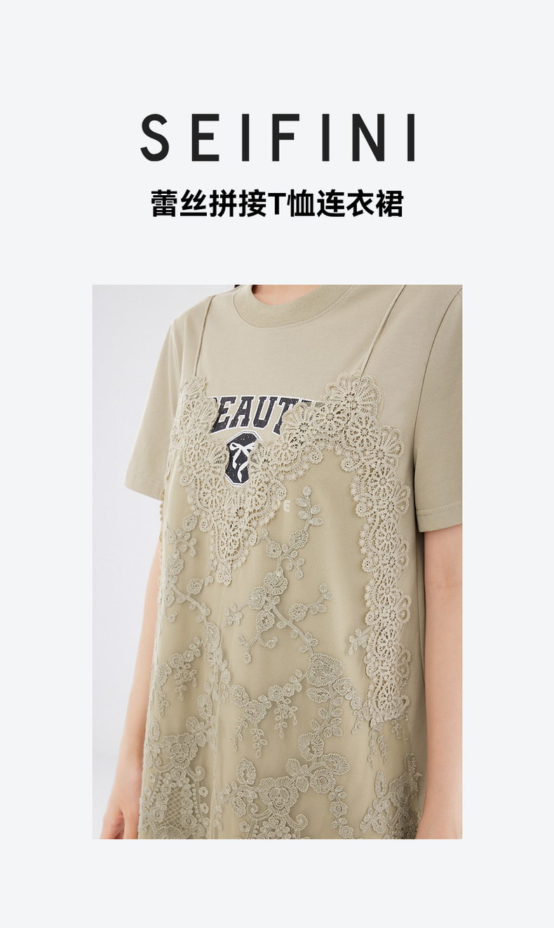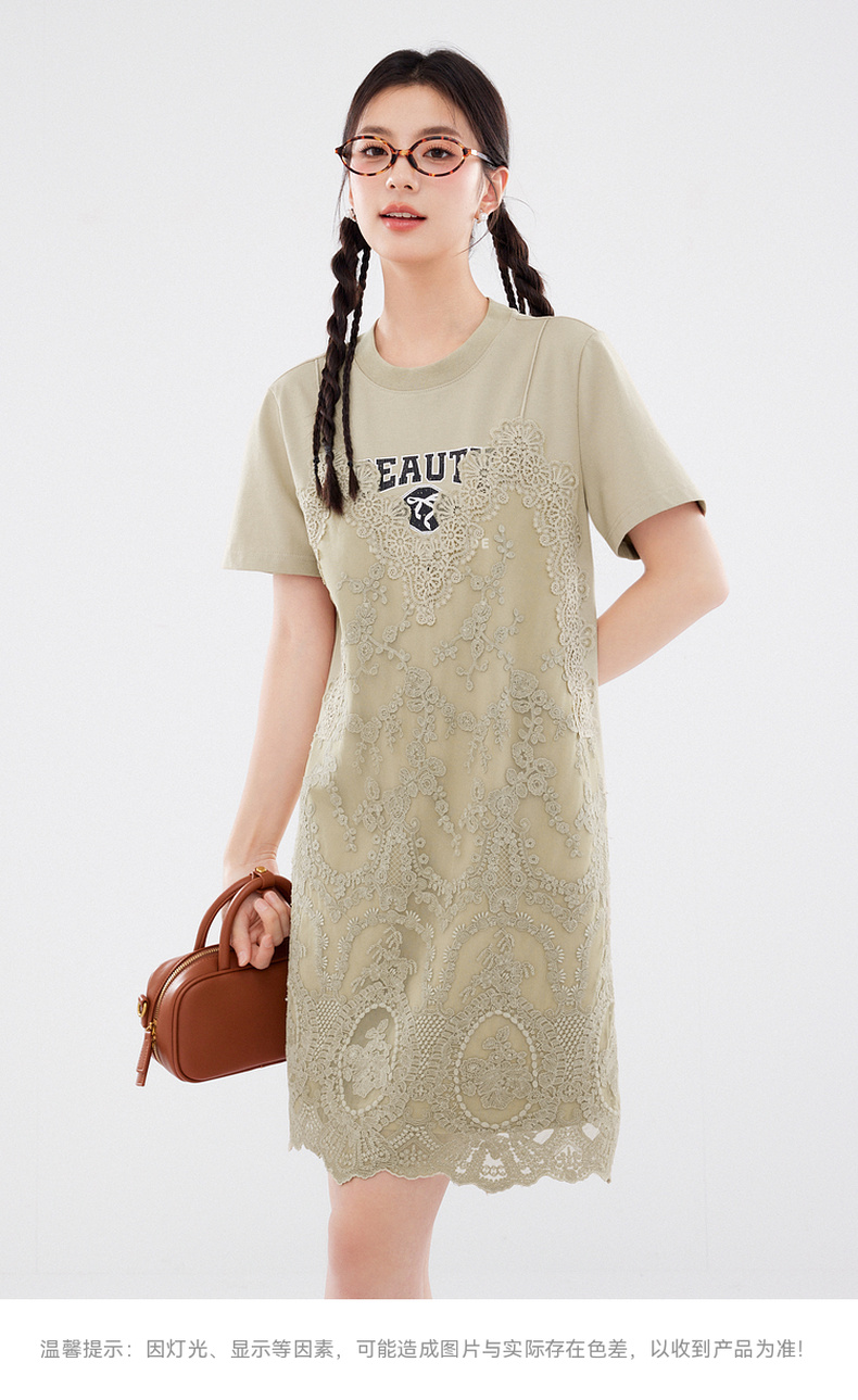 【严选】诗凡黎假两件蕾丝拼接T恤连衣裙2024夏新款洋气圆领直筒裙女SF6391641