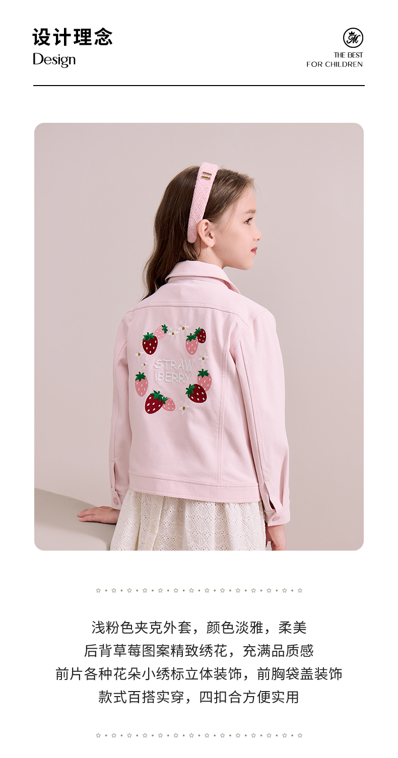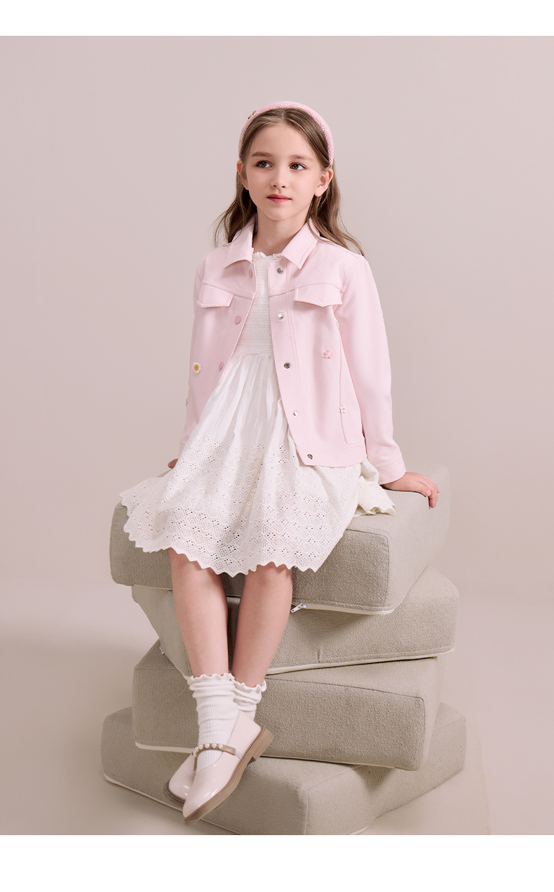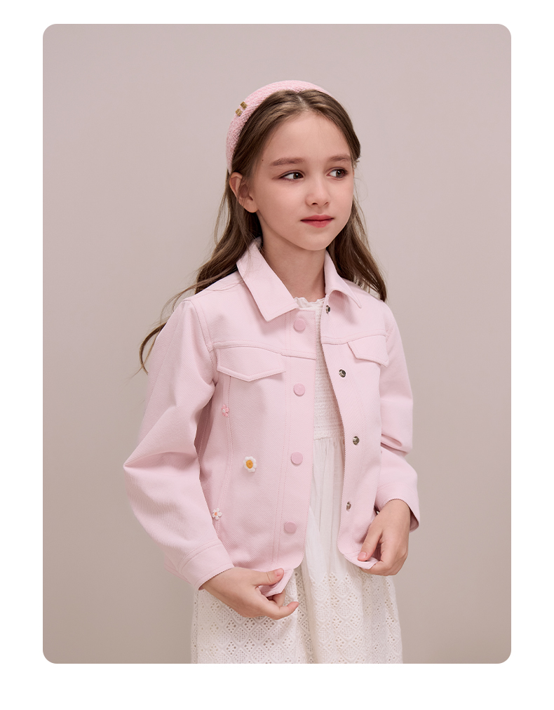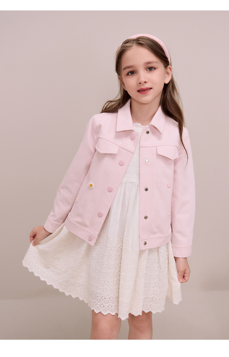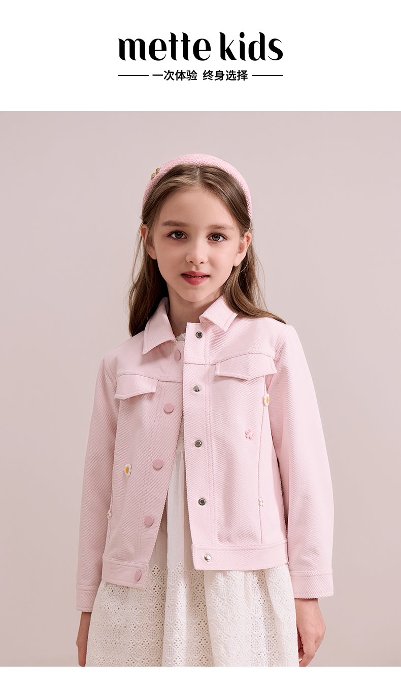mettekids儿童粉色牛仔外套2024秋新款女童绣花正肩中空纱夹克